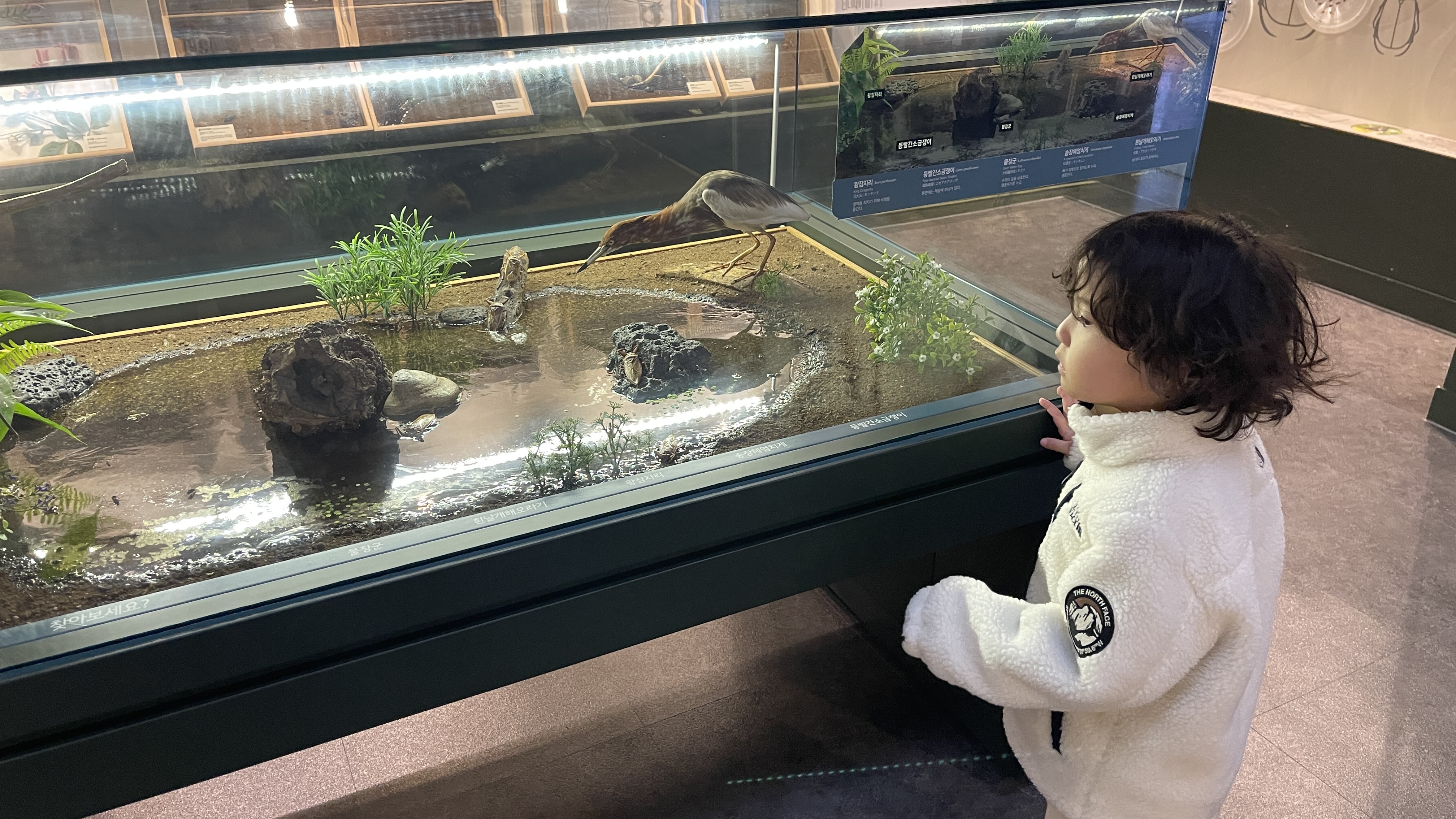 동식물 전시관은 아주 신박한 도구가 있었다. 실제 전시관을 그대로 비추고 있는 증강현실을 적용시킨 듯한 이 화면. 전시관 안의 동물과 똑같은 배치이지만 살아움직이는 동물들이 보여서 아이들의 호기심을 자극한다. 그냥 보고 있으면.. 아 그렇구나 하고 지나갈 곳이건만 이 장치 하나로 재미있는 공간으로 탈바꿈되었다.