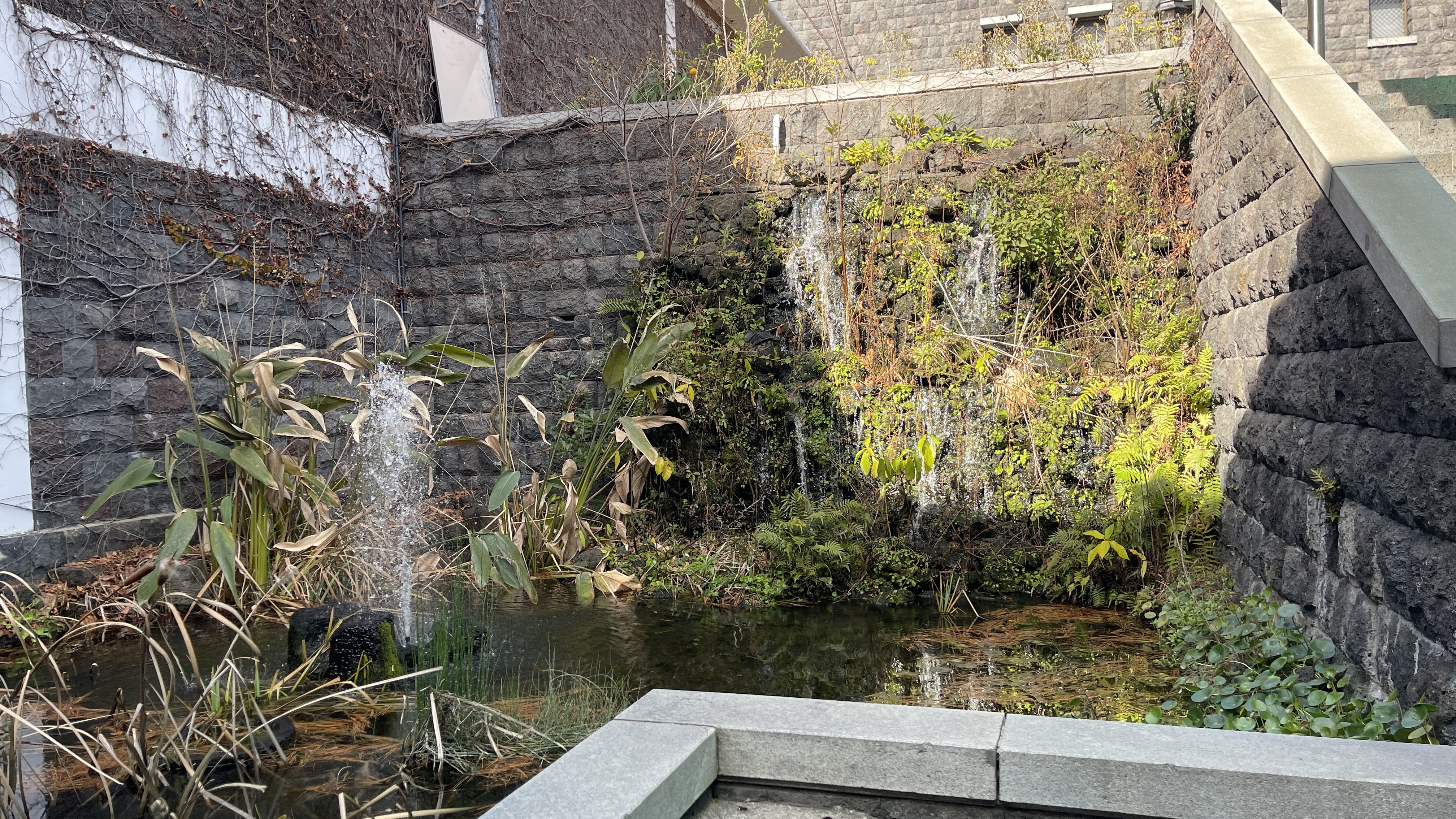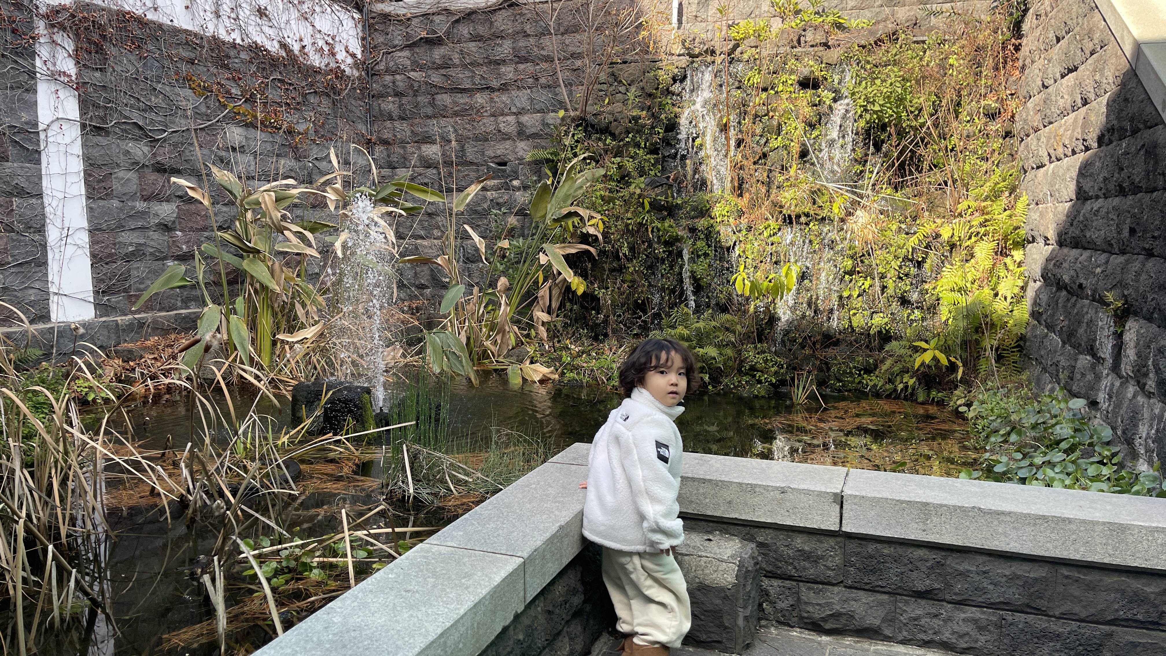 내려가는 계단에서 물소리가 나길래 보았더니 조그만 인공폭포와 연못이 만들어져 있다. 신기한지 라온이는 한참이나 그곳에서 떠날 줄을 모른다.