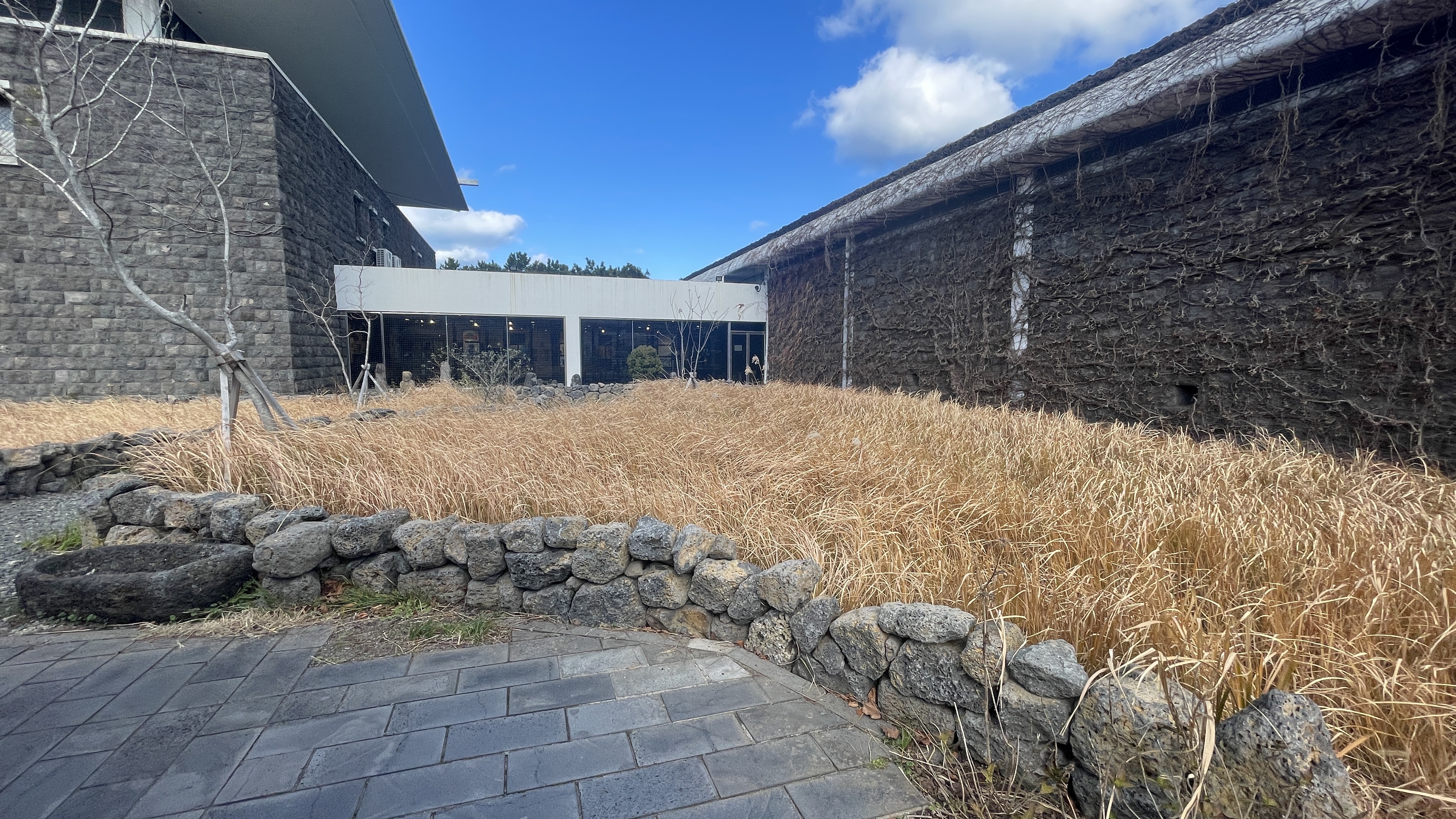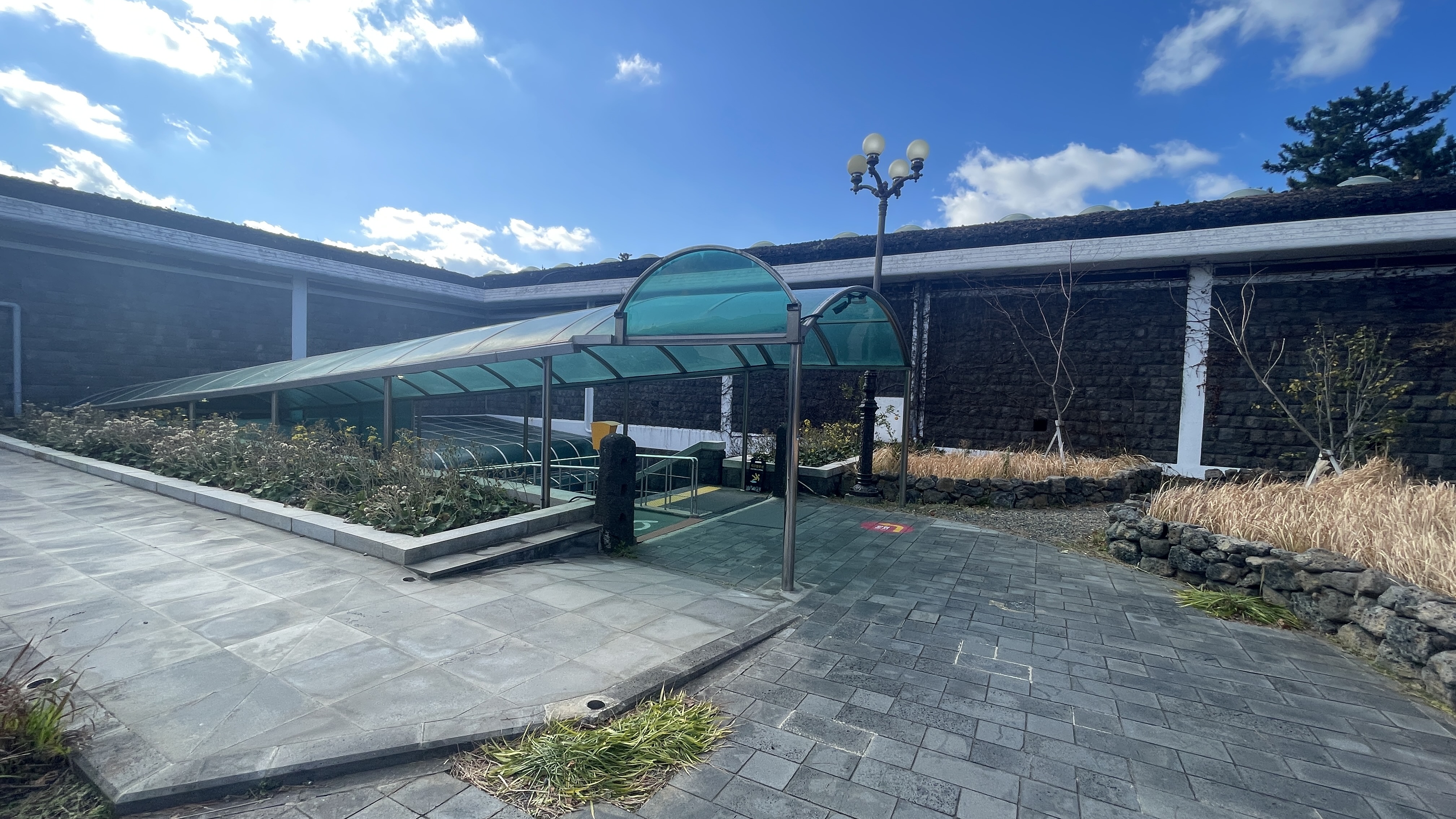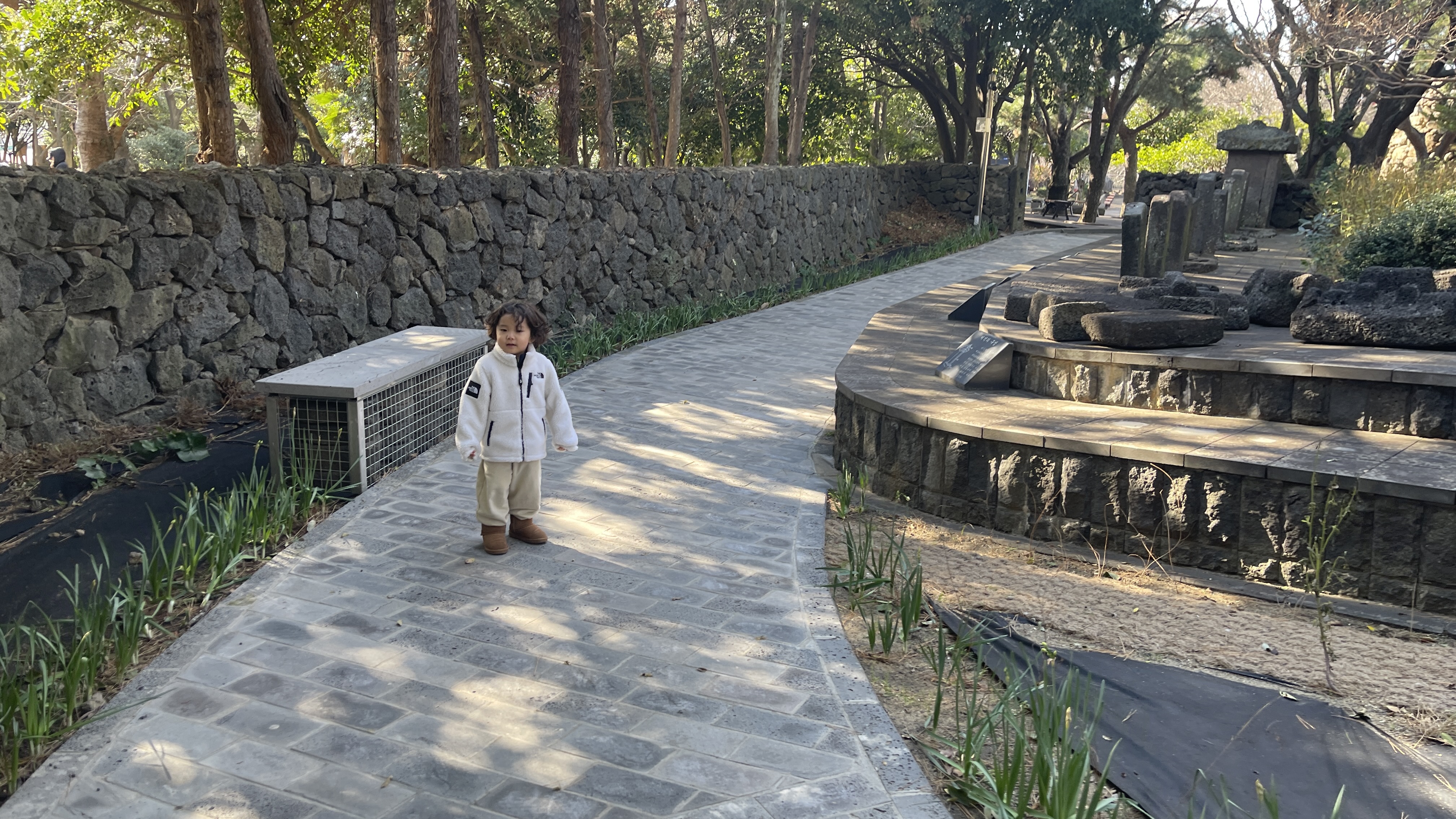 식물전시장 쪽으로는 돗통시와 산책로가 있고, 담 넘어로는 신산공원에서 산책을 즐기고 있는 사람들이 보인다.