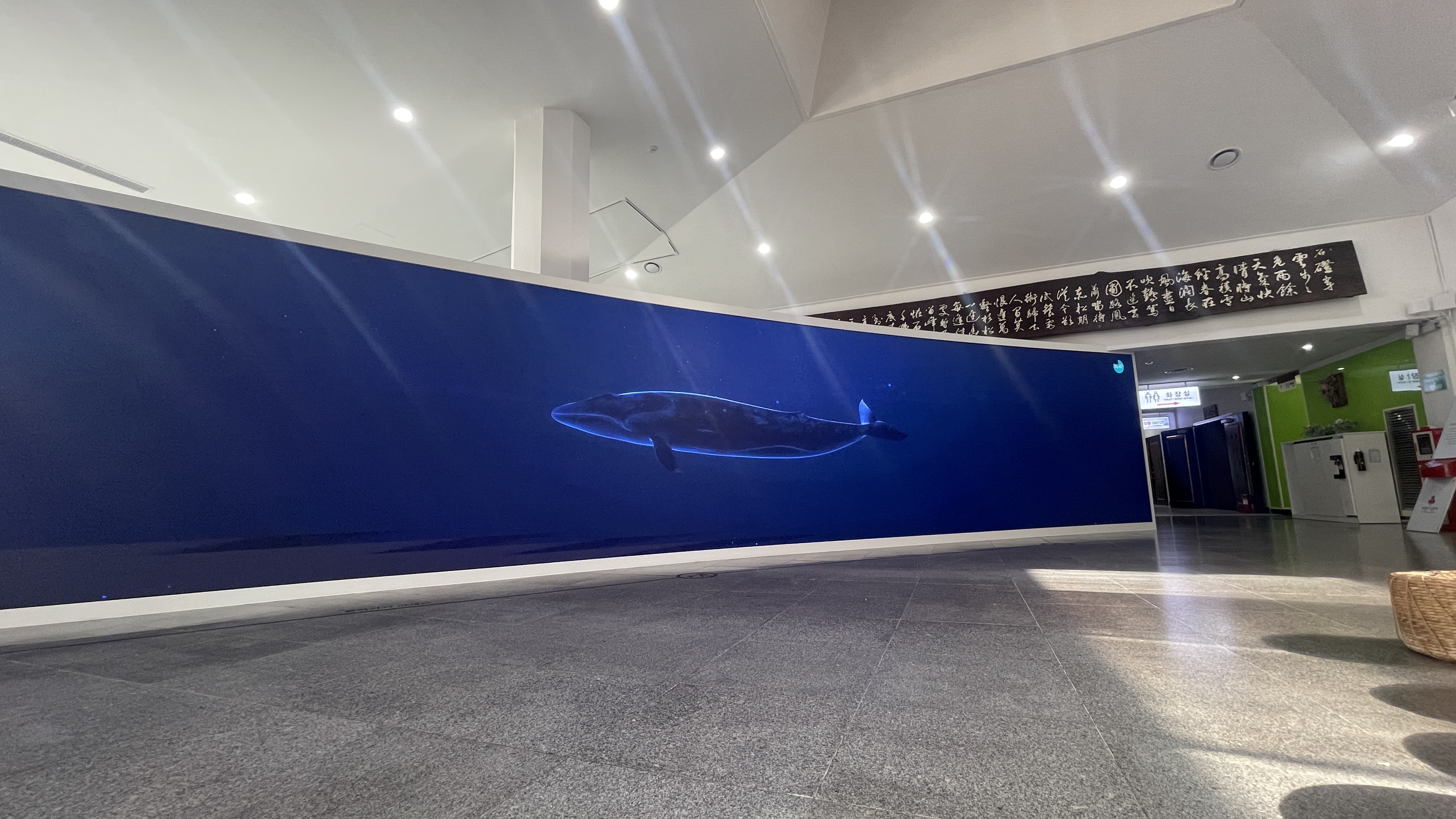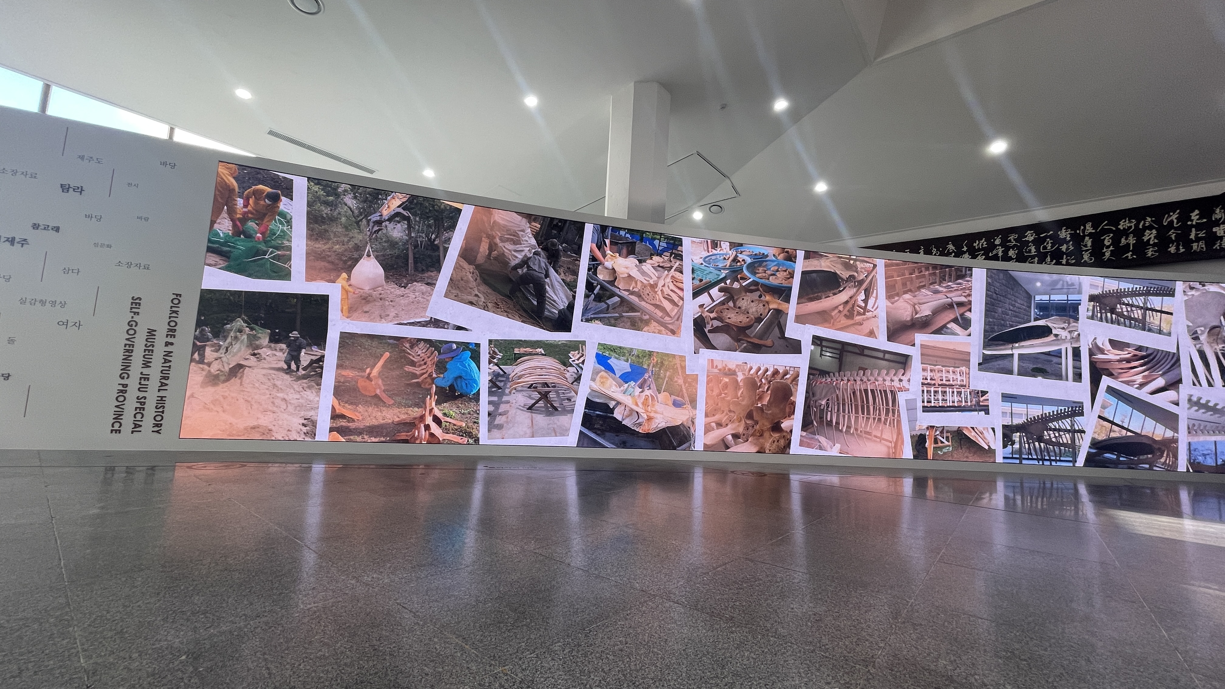참고래 전시 옆에는 대형화면을 통해 참고래 뼈대가 오게된 과장과 제주의 모습에 대한 영상이 흘러나오고 있어 잠시동안 앉아서 관람하기 좋았다.
