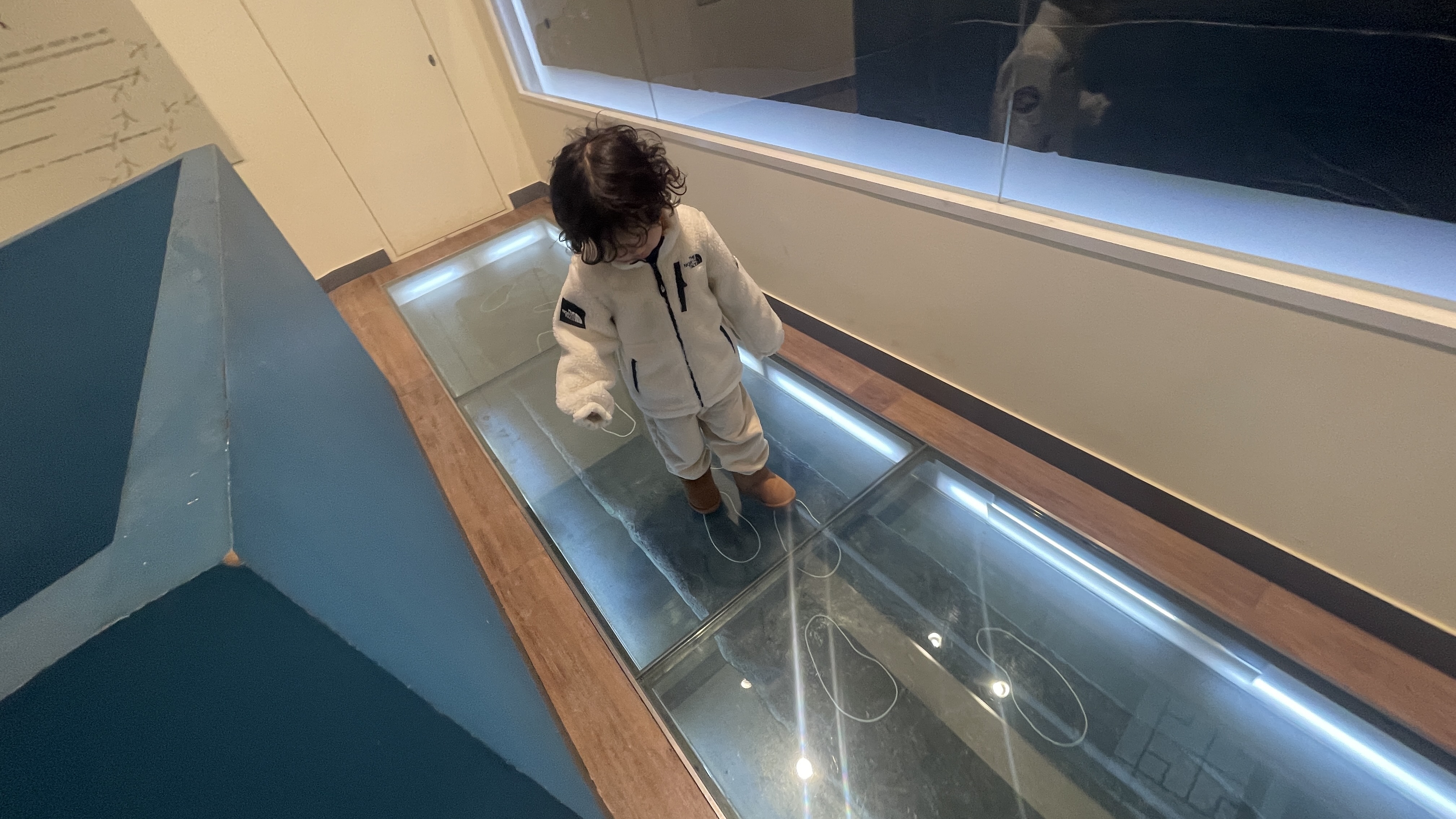 고래뼈가 전시되어 있는 공간에 모래가 있다면서 들어가 보고 싶다고 한다.
