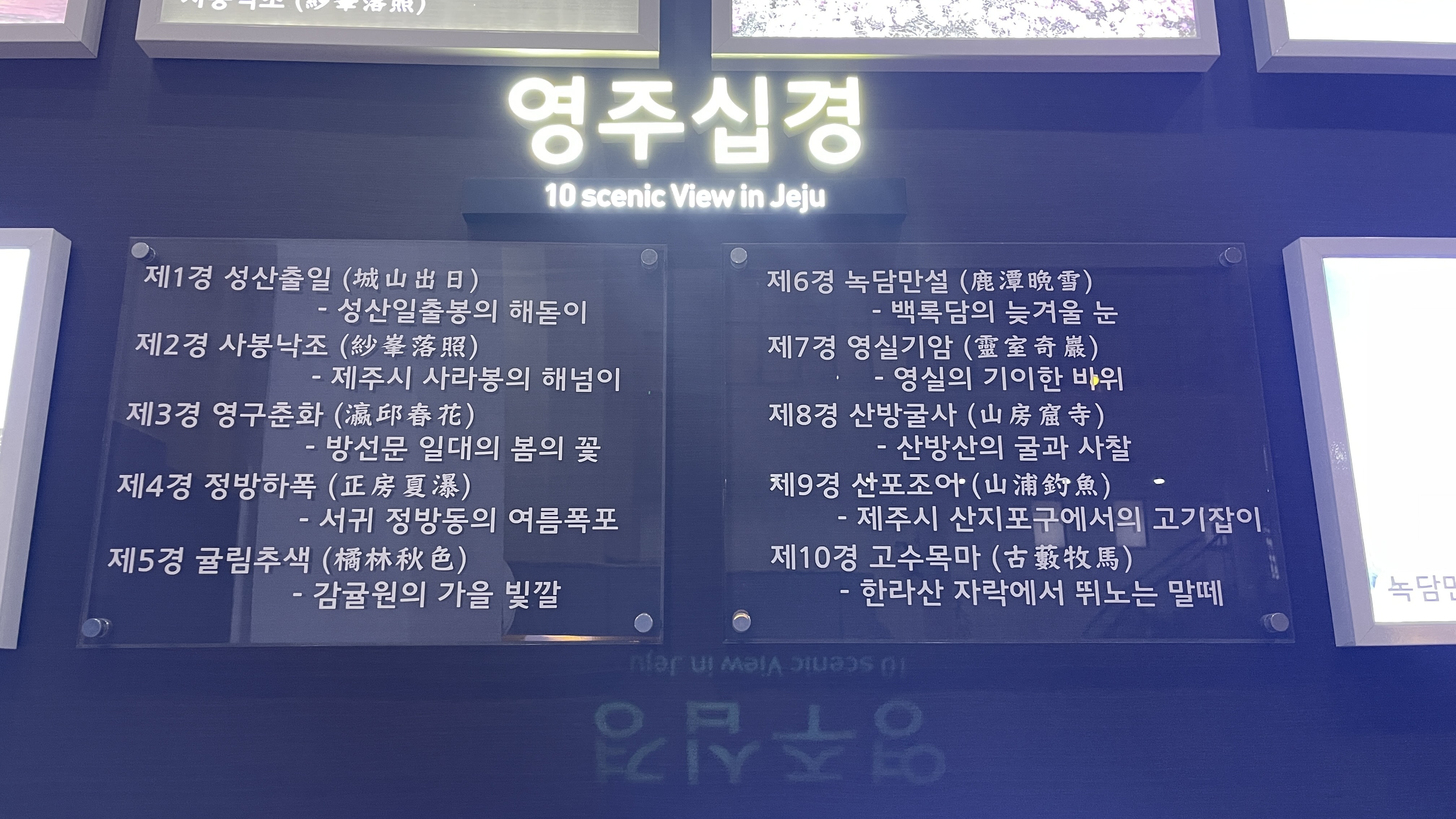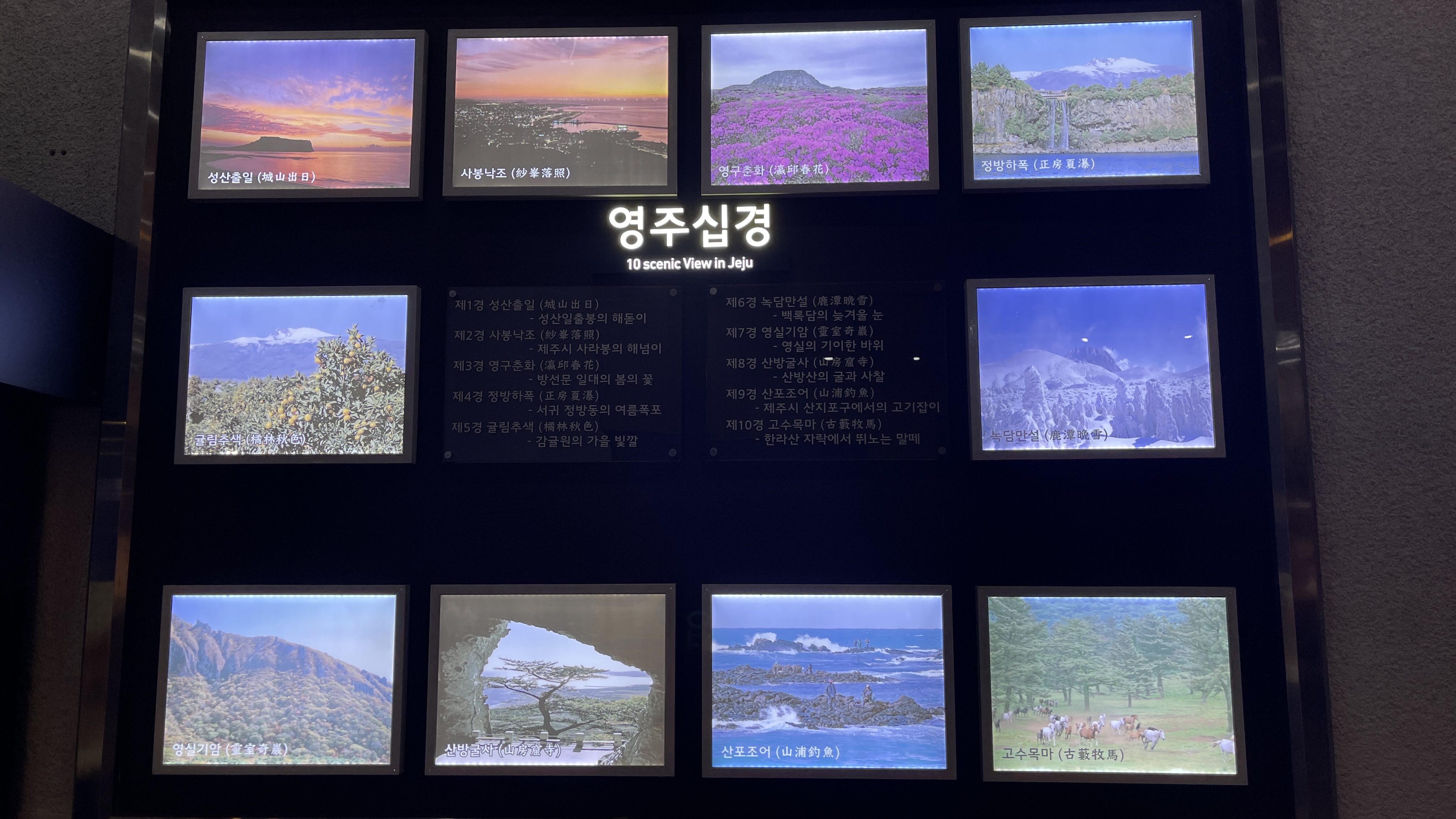 오늘 처음 들어 본 영주십경인데, 이 10경중에 가본 곳이라곤... 정방폭포, 산방산, 그리고 말떼 성산일출봉은 보았지만 해돋이는 못봤고, 사라봉은 얼마 전 올라가보았지만 해넘이는 못봤고, 한라산은 한번도 오르지 못해서 그 어느 것도 보지 못했다. 그러고보니 산방산도 산만 보았지, 굴이나 사찰엔 올라가본 기억이 전혀 없다.