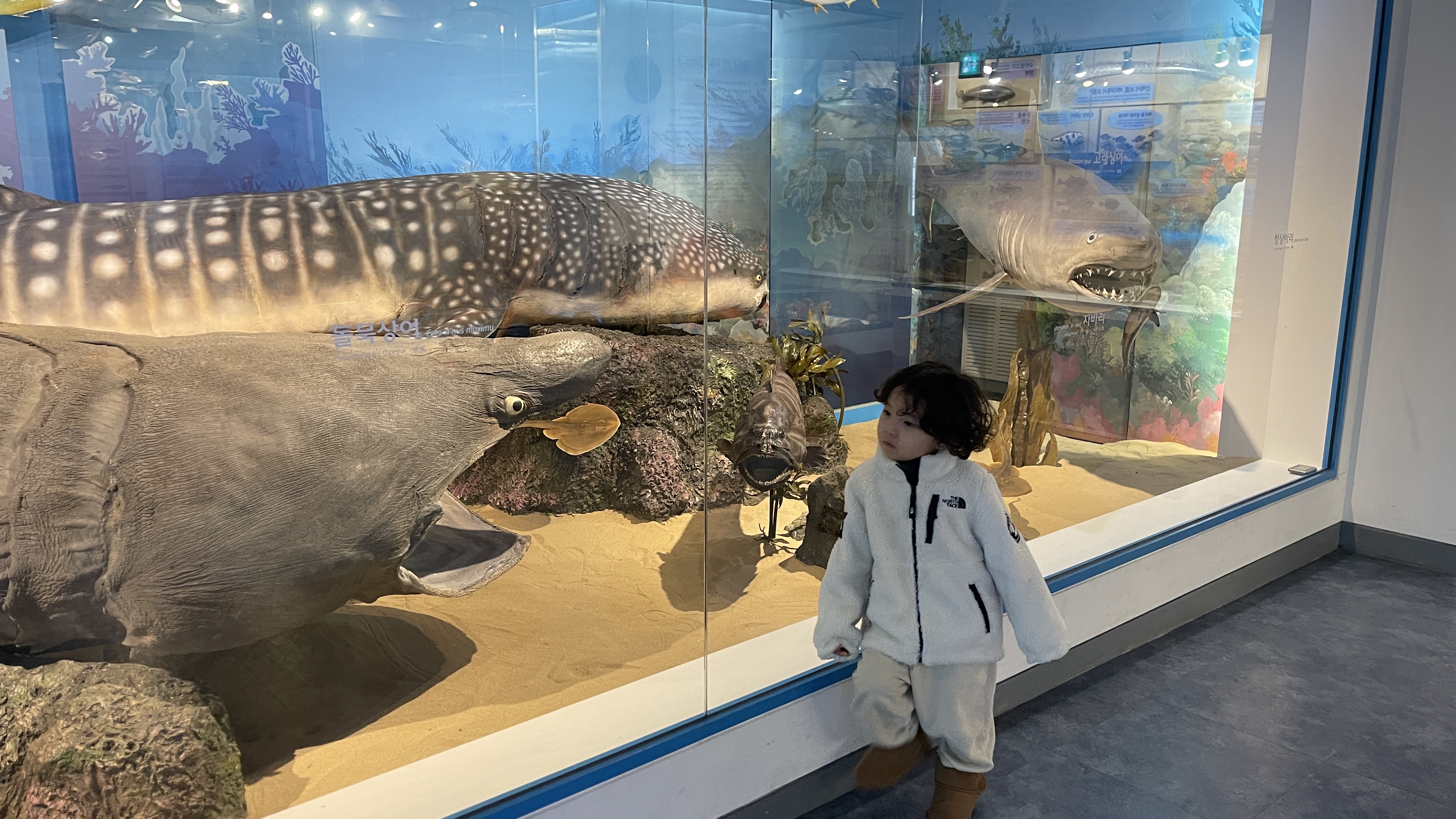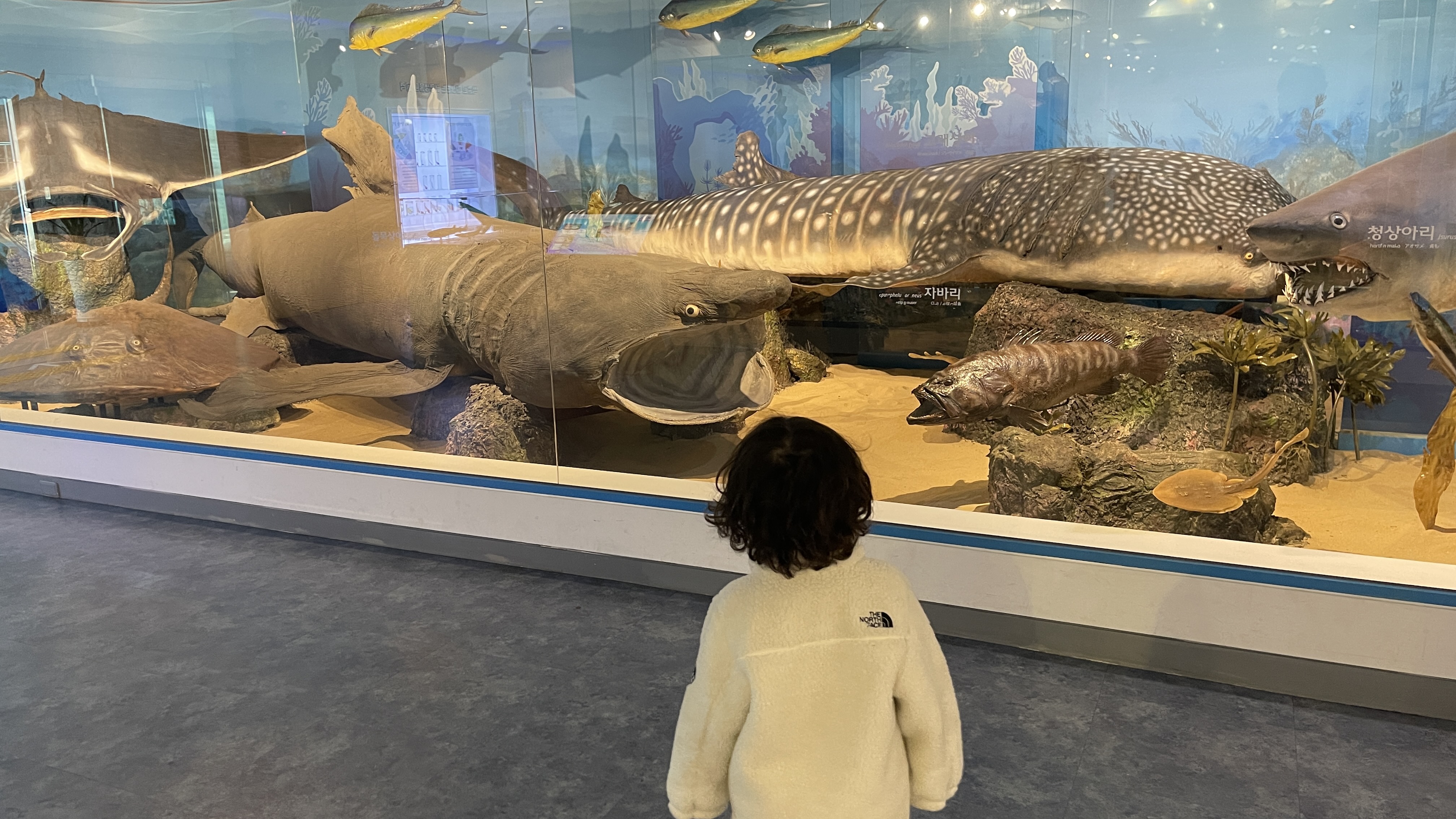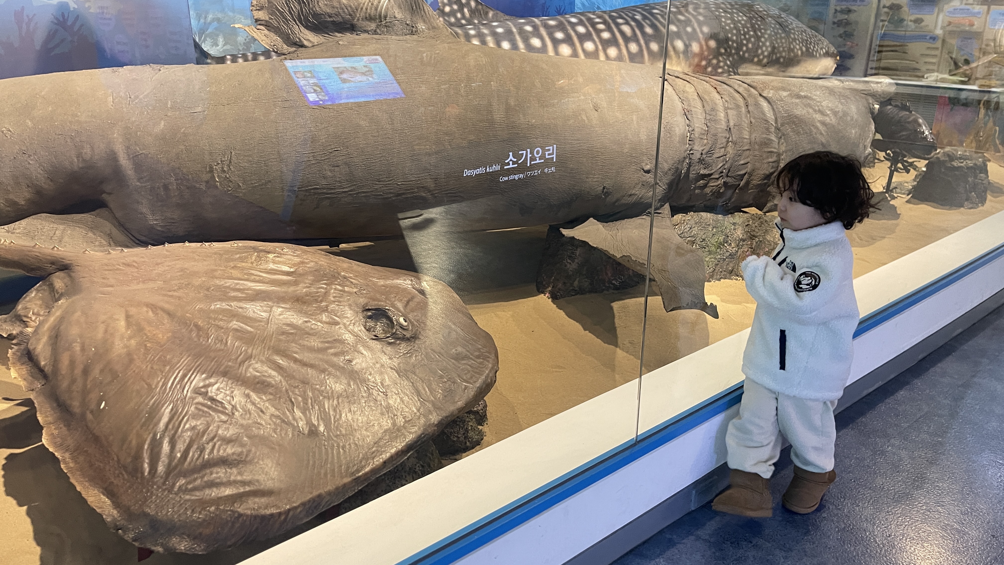 고래상어와 대형가오리들도 만날 수 있다. 너무 큰 상어가 있는데 너무 커서인지 라온이는 그냥 통나무인줄로만 안다. ^^