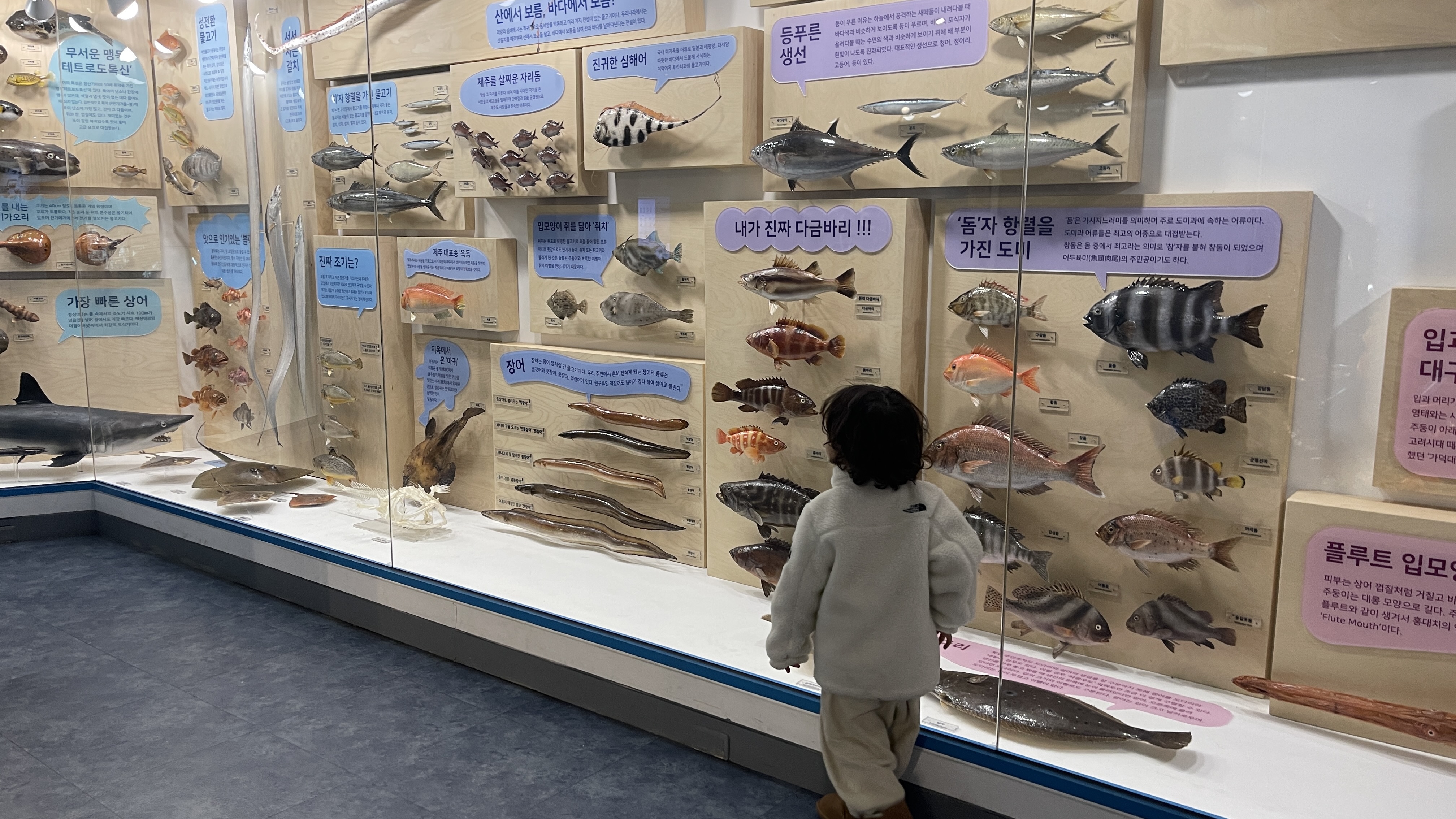 다양한 수중생물 표본도 전시되어 있어서 아이들의 생태학습에 도움이 많이 될 것 같다. 라온이도 이거저거 물어보면서 무언가를 알아가는 재미가 있어 보였다.