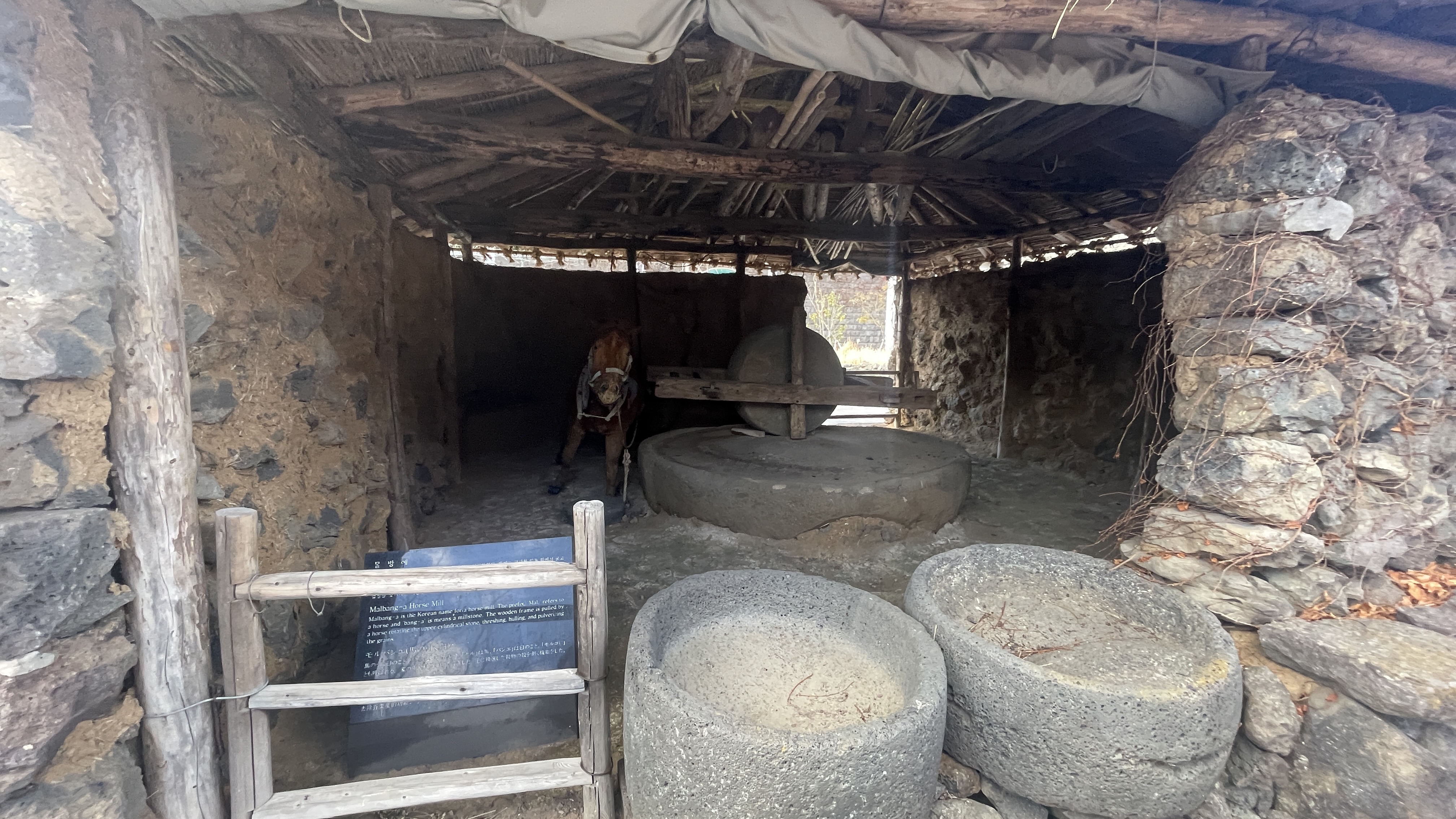 끝난 줄 알고 그냥 갔으면 큰일날뻔 했다. 밖으로 나가니 바다전시관이 아니라 제주 전통가옥이 한채 보인다. 그리고 안에는 연자방아같이 돌아가는 게 보이는데 소가 아니라 말이 끌고 있는 것이 이색적이다.