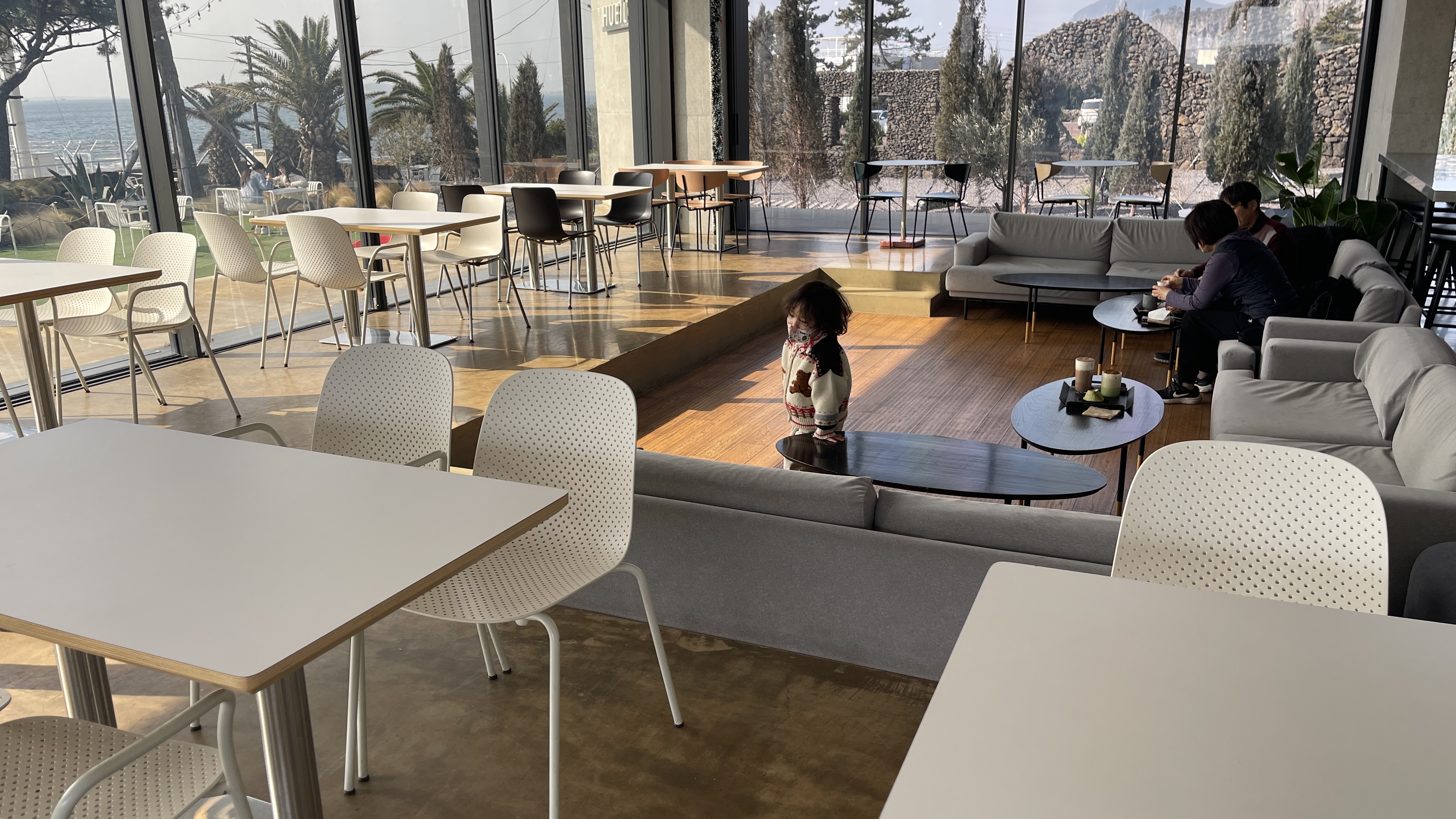 하지만 하나둘 사람이 늘어나기 시작하더니 잠시 뒤 이 모든 공간의 테이블엔 전부 사람들로 득실득실.. 어디에서 그 많은 사람들이 나타난건지.. 여전히 의문이다. 제주카페 대부분이 해안가에 위치해 있어서, 뷰가 웬만하면 전부 좋긴 한데, 휴일로 카페의 뷰는 압도적인 듯 하다.