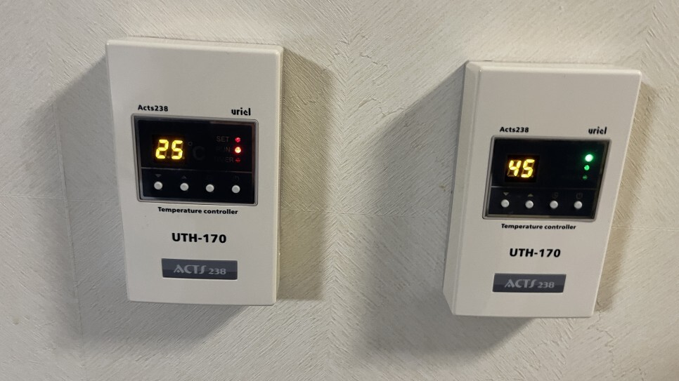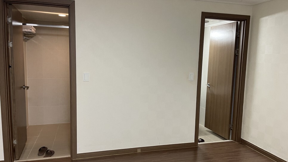 샤워실엔 두개의 샤워부스가 설치되어 있기 때문에 동시에 샤워도 가능하다. 각각의 공간에는 어메니티와 비누가 준비되어 있다.