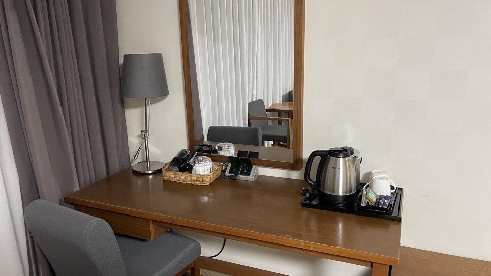 티테이블이며, 화장대 등 웬만한 호텔보다도 나아보인다. 방 규모가 넓어서인지 TV가 좀 많이 작아보이긴 했지만, 이정도는 감안할 수 있다.