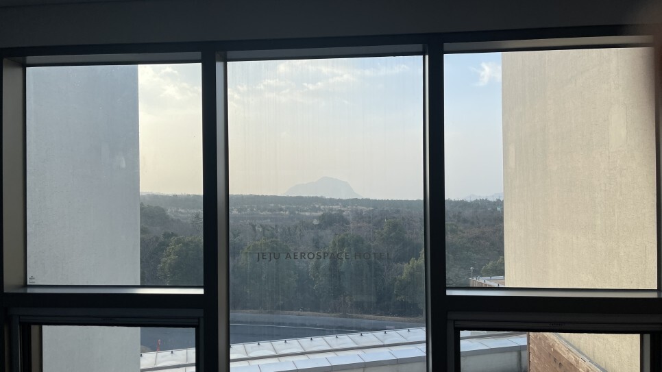 체크아웃하려고 로비로 가려는데 창문으로 산방산이 보인다. 미세먼지가 심하지만 않았다면 아주 선명하게 보일 위치다. 엘리베이터 앞에서 보는 풍경도 이렇게 좋다니..