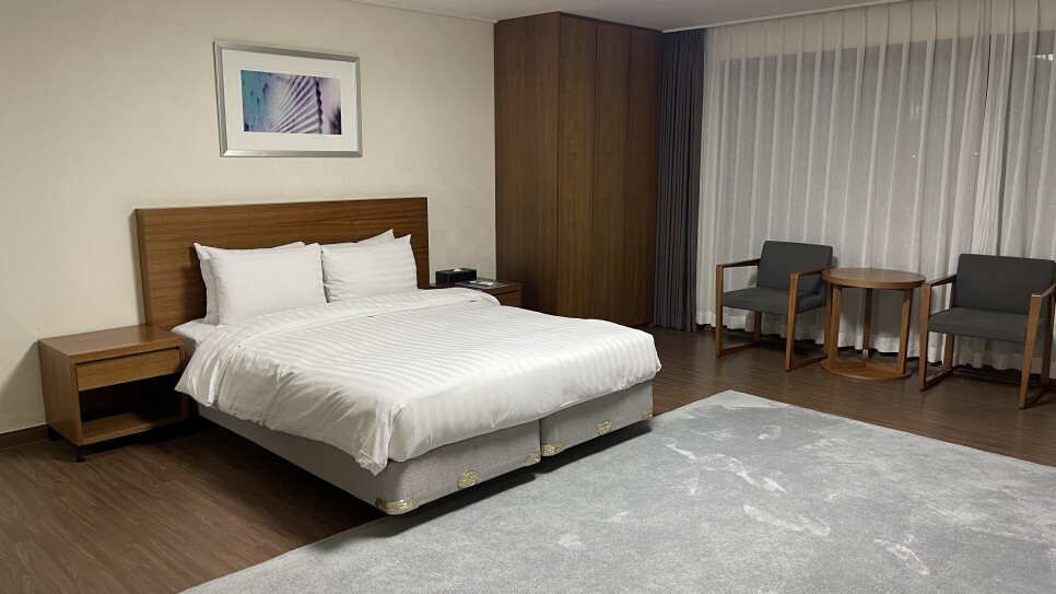 어플에서 보았던 그 느낌 그대로인 디럭스 더블룸. 와~~~~~ 라는 탄성이 절로 나온다. 6만원대 방이 이렇게 넓어도 되는건가 싶다. 두사람이 지내기엔 너무 넓다. 네사람이 투숙해도 여유 있을 것 같은 공간이다. 침대 역시 싱글베드 두개를 합친 모양이지만 킹사이즈 정도 되니, 우리처럼 아이포함 세식구가 투숙해도 침대밑으로 떨어질 염려는 전혀 없어 보인다.