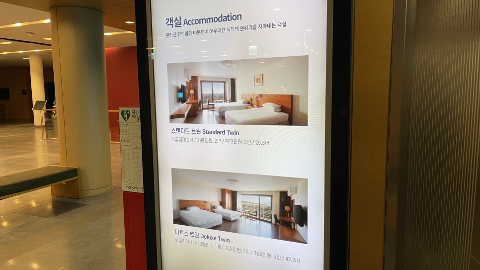 제주항공우주호텔은 A동과 B동으로 나뉘어져 있었고, 총 5개층으로 구성되어 있다. 엘리베이터 옆엔 객실 안내 사진이 보이는데 제법 깔끔한 이미지이다. 이렇게만 봐서는 특급호텔들과 큰 차이는 없어 보인다. 가격만 놓고 보자면 가성비 제법 있어 보이는 첫인상이다.