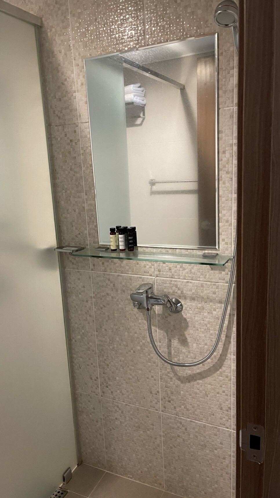 매번 숙소에 갈때마다 콘센트 찾느라 바쁜데, 화장대 위엔 콘센트 2개가 놓여져 있고 헤어드라이기도 준비되어 있다. 그밖에 면봉이나 화장솜, 바디로션 등의 어메니티도 있다. 바디로션은 아주 향긋한 냄새이며 샤워부스에 비치된 어메니티와 같은 향이다.