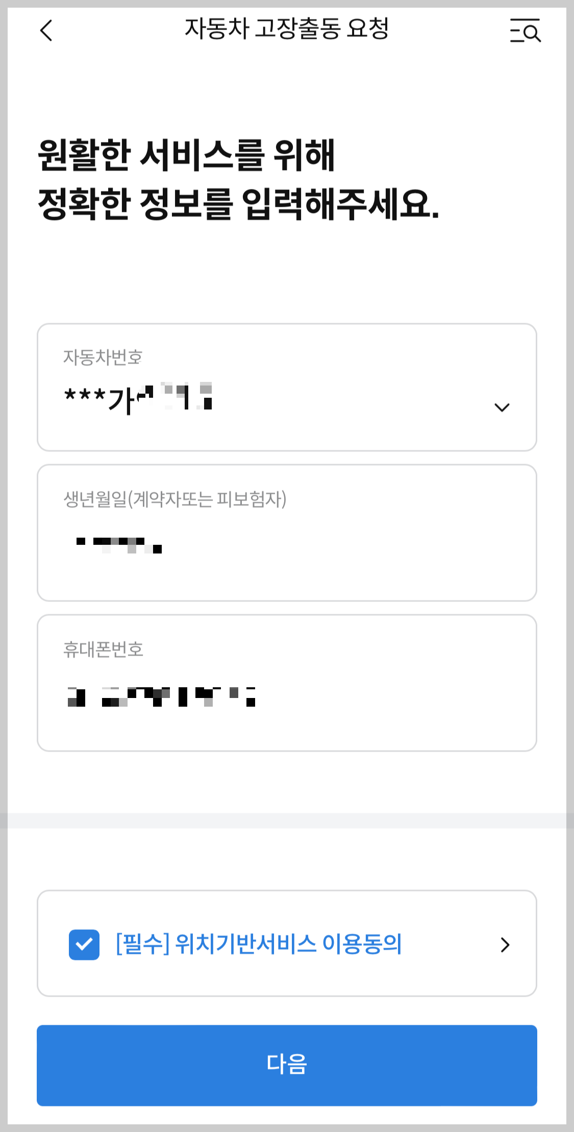 2. 자동차 번호 선택하고, 위치기반서비스 이용동의를 선택하고 '다음' 버튼을 눌러준다.
