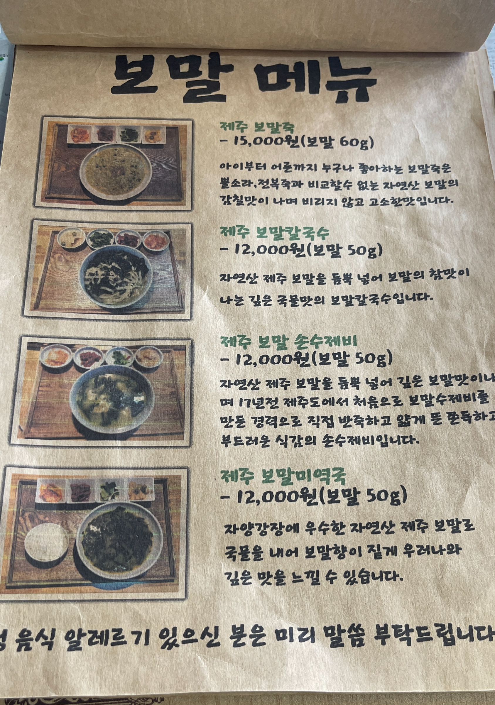 제주 보말죽(15,000원), 제주 보말칼국수(12,000원), 제주 보말 손수제비(12,000원), 제주 보말미역국(12,000원)