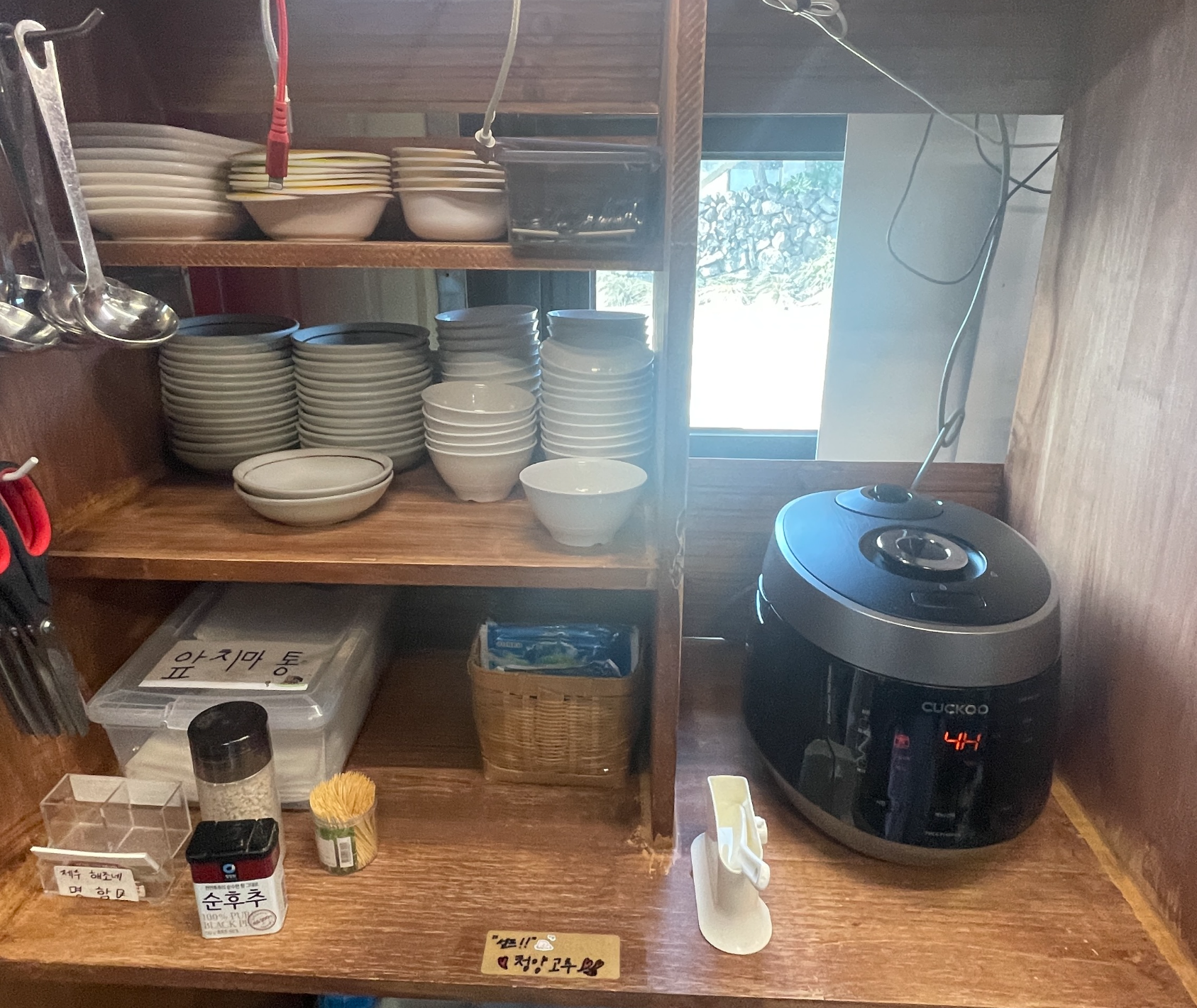 가게 중앙 위치에 이렇게 밥솥, 앞접시, 후추, 청양고추, 앞치마, 이쑤시개, 명함?? 등이 놓여져 있으니 필요하면 가져다 사용하거나 먹으면 된다.