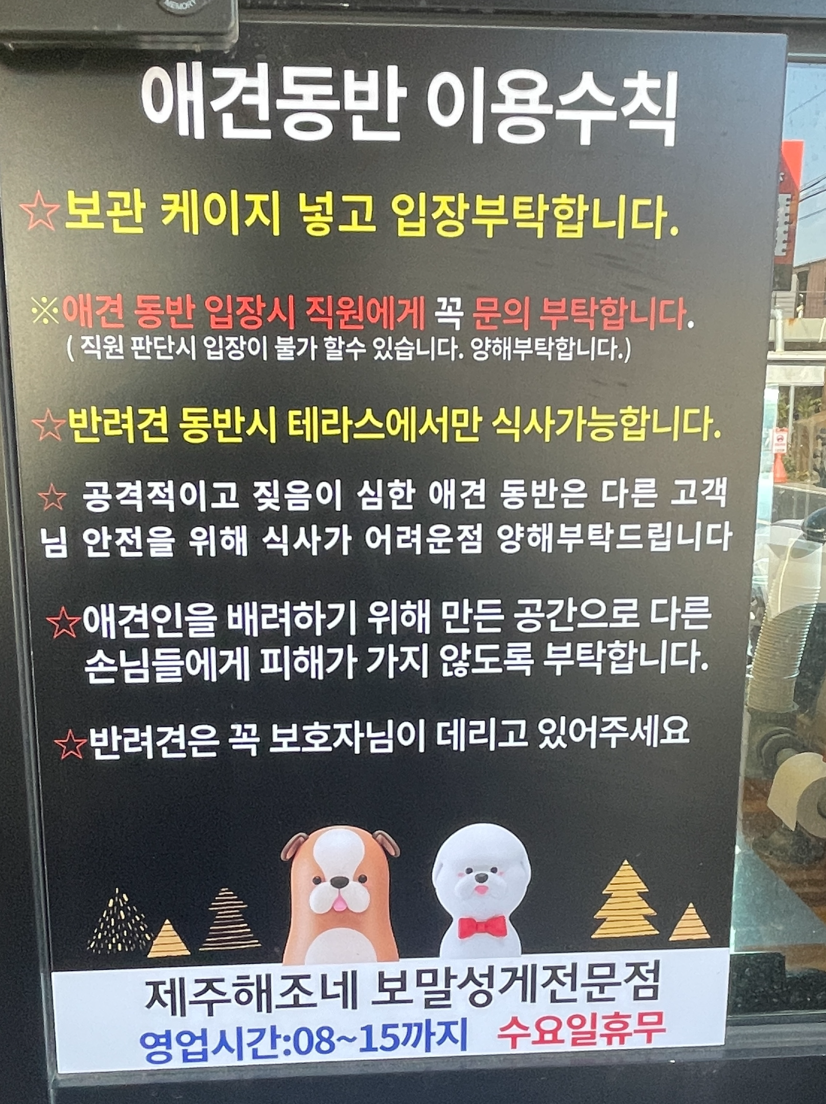 성게, 보말, 구이류를 중심으로 구성된 제주해조네 메뉴. 자연산 성게와 보말만을 이용하여 음식을 만들고 있고, 반찬의 재사용을 줄이기 위해 이곳도 한상차림으로 내온다고 한다. 요즘은 어딜가나 반려견을 데리고 다니는 사람들이 많아서인지 애견동반 이용수칙도 걸려있다.