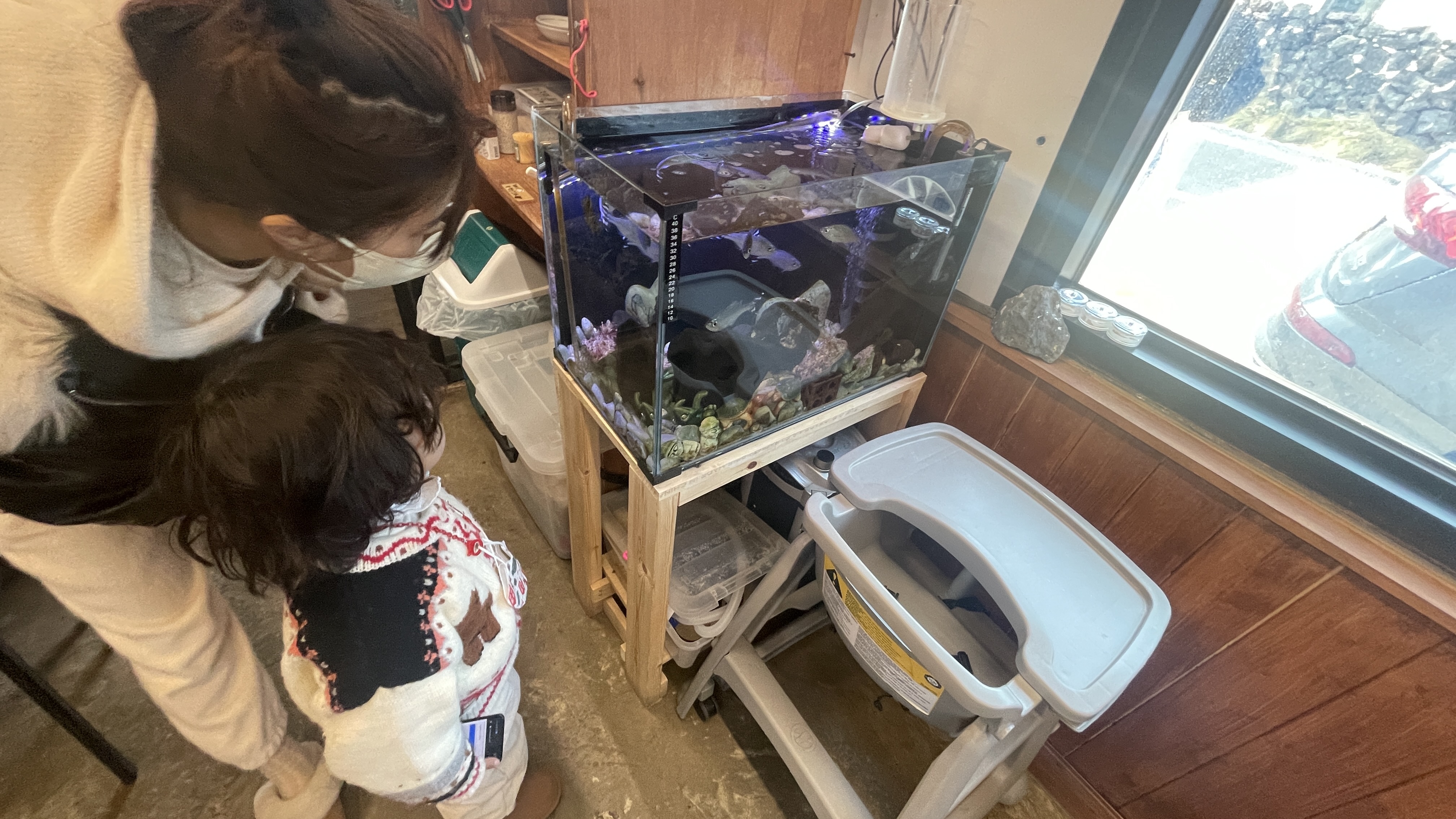 나오는 길에 보이는 미니 수족관에서 눈길을 떼지 못하는 라온이. 조만간 아쿠아플라넷이라도 다녀와야 되려나.. 마트 수산코너의 물고기들이 헤엄치는 것만 보아도 좋아하더니.. 그러고 보니 아기의자가 여기 있네~