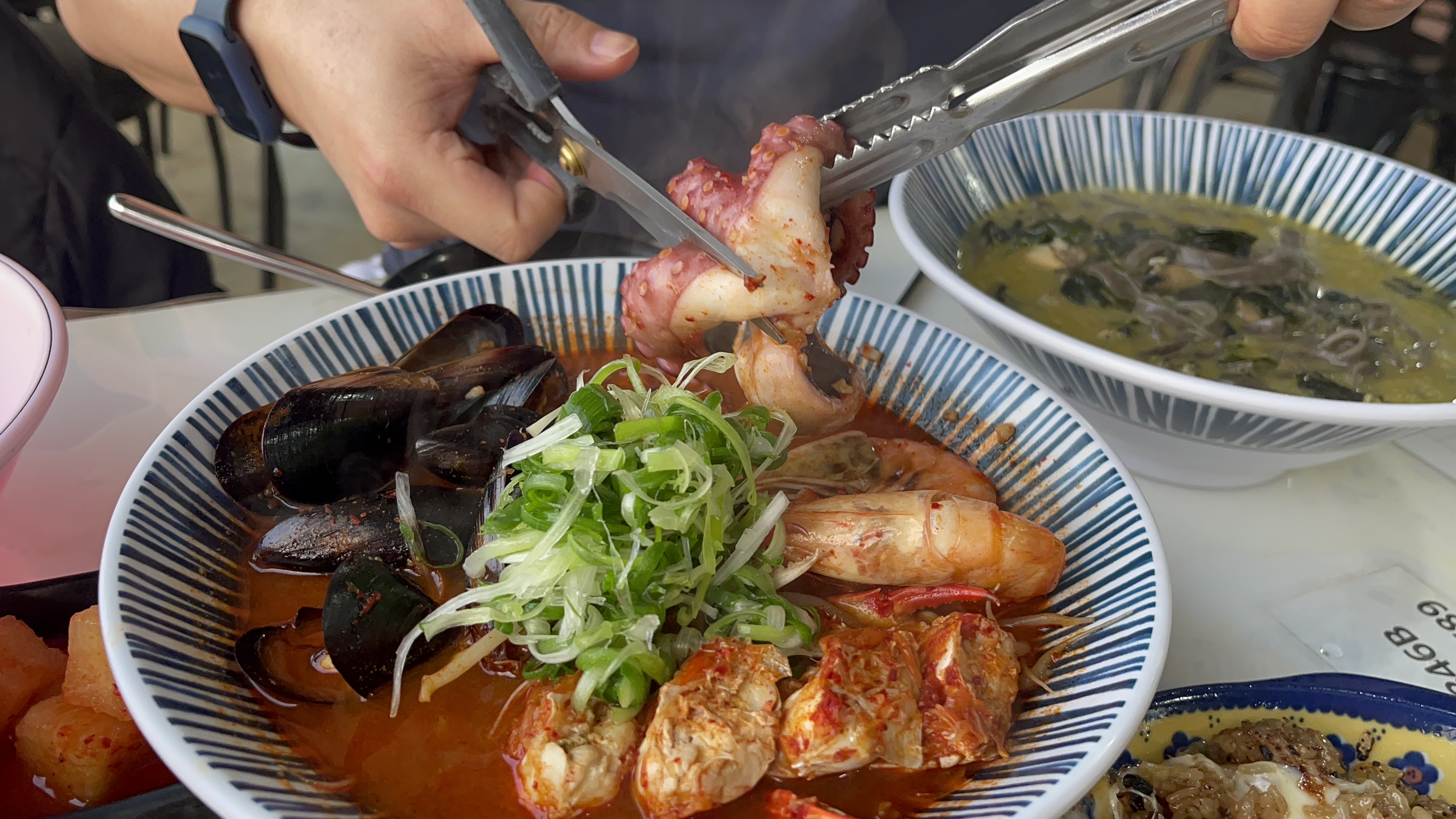 꽃게부터 시작해서 새우, 홍합, 문어를 아주 야무지게 먹어주고 라면까지 달려본다. 배가 조금씩 차오르기 시작했는데, 라면이 나오는 시간도 오래걸리다 보니, 빨리 먹지 않으면 뇌가 그만먹으라고 명령을 내릴 것만 같다.