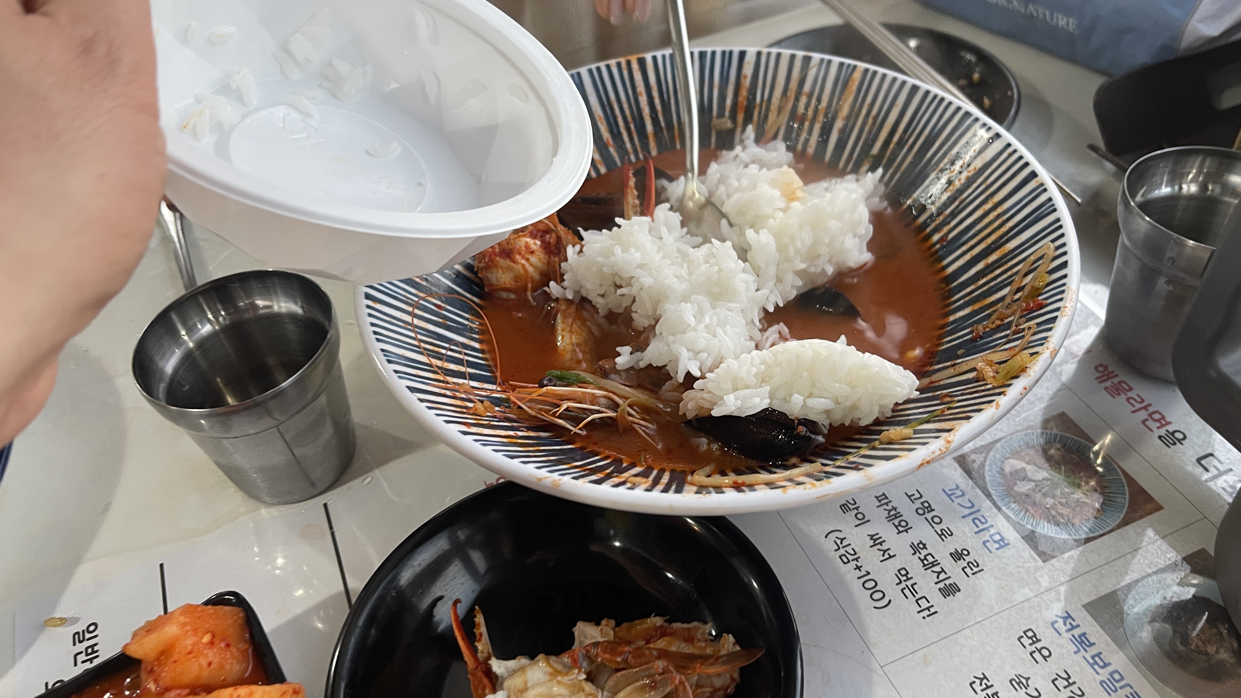 다이어트 중이라는 와이프는 면과 해산물을 야무지게 먹은 뒤 밥까지 말아달라고 한다. 진짜 맛있나보다. 공기밥은 별도로 없고, 주문 시 햇반을 돌려주신다. 공기밥보다는 햇반이 진리죠.