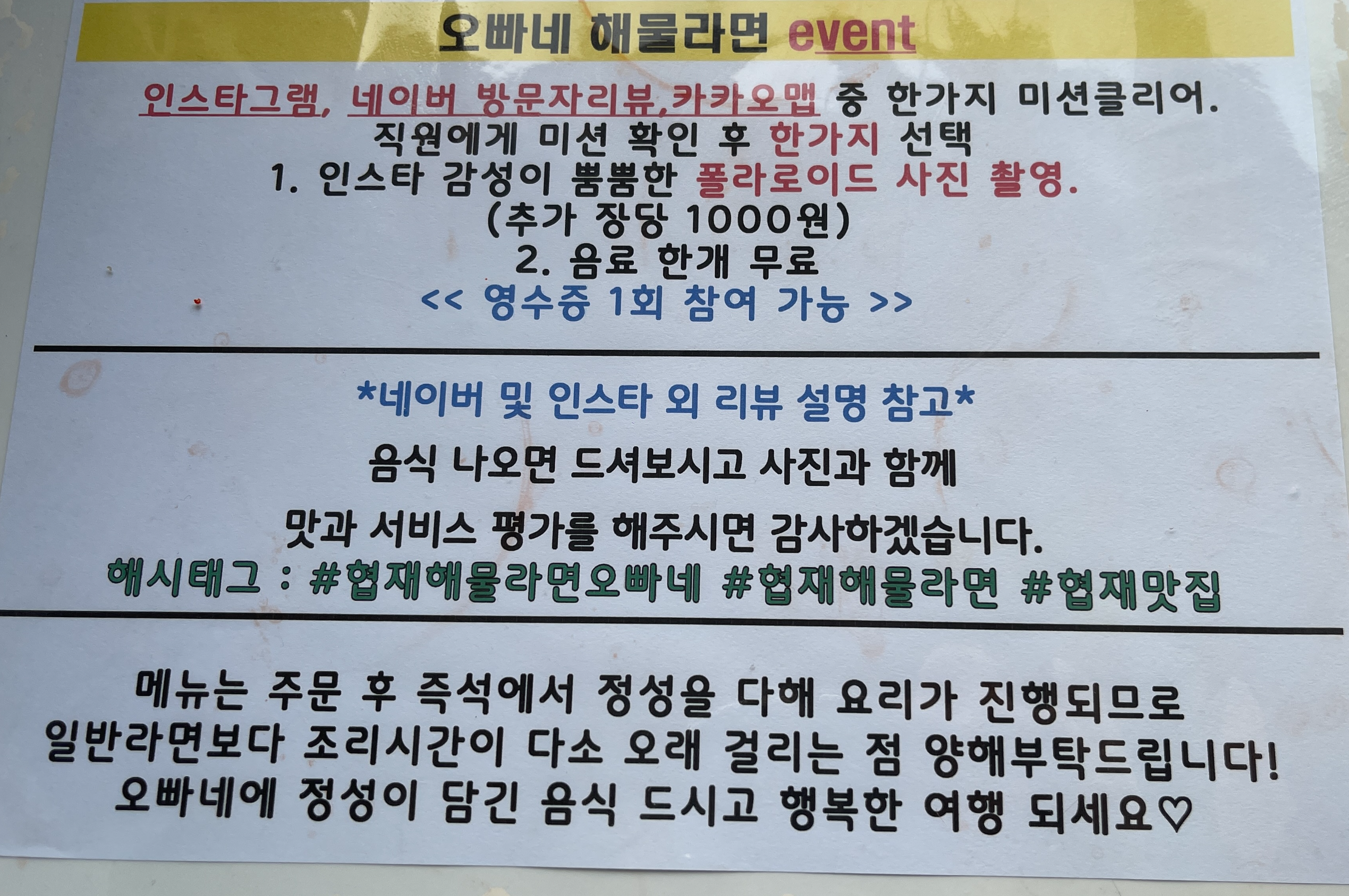 카운터에는 협재해물라면 오빠네 메뉴가 어떻게 만들어지는가에 대한 소개가 나와 이쏙, 테이블 위에는 어떻게 먹으면 맛있는지에 대한 먹는 방법이 나온다. 가급적이면 먹는 방법대로 먹는게 가장 맛있다!
