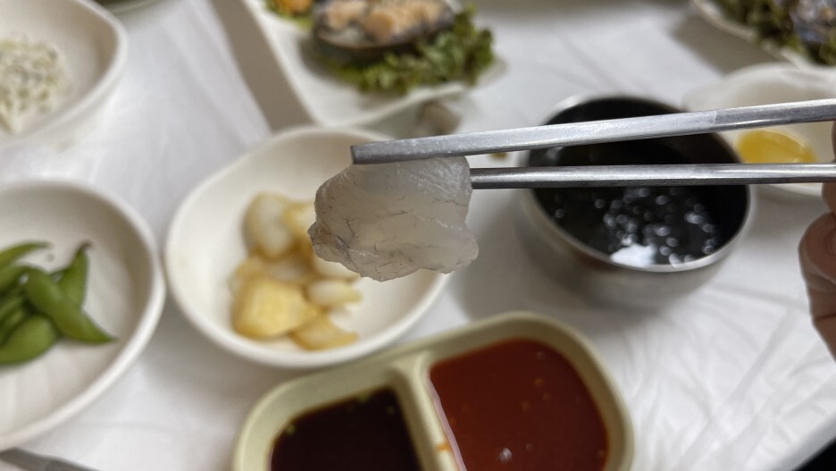 누가 먼저랄 것도 없이 부모님과 나는 복어회부터 집어들어 본다. 워낙에 비싸서 자주 접해볼 수 없는 복어회를 이렇게 모둠회로 즐길 수 있는 것도 일출횟집이라 가능한게 아닐까 싶다. 사장님의 수완이 좋다고 할 수 밖에! 주문진횟집을 찾는다면 복어회도 맛볼 수 있는 일출횟집이 정답이다!