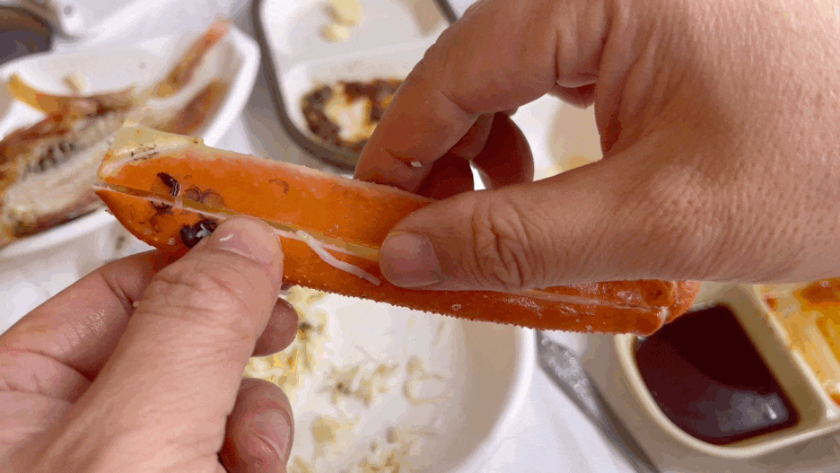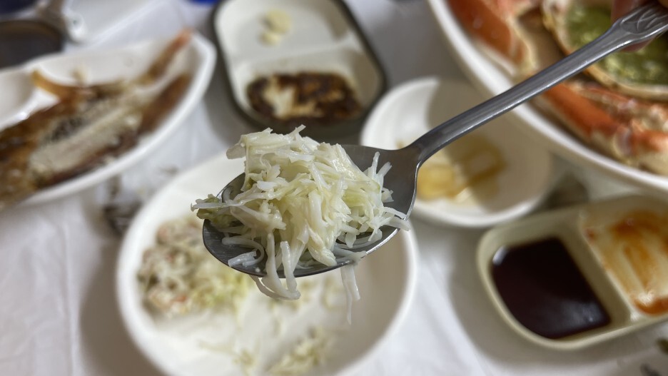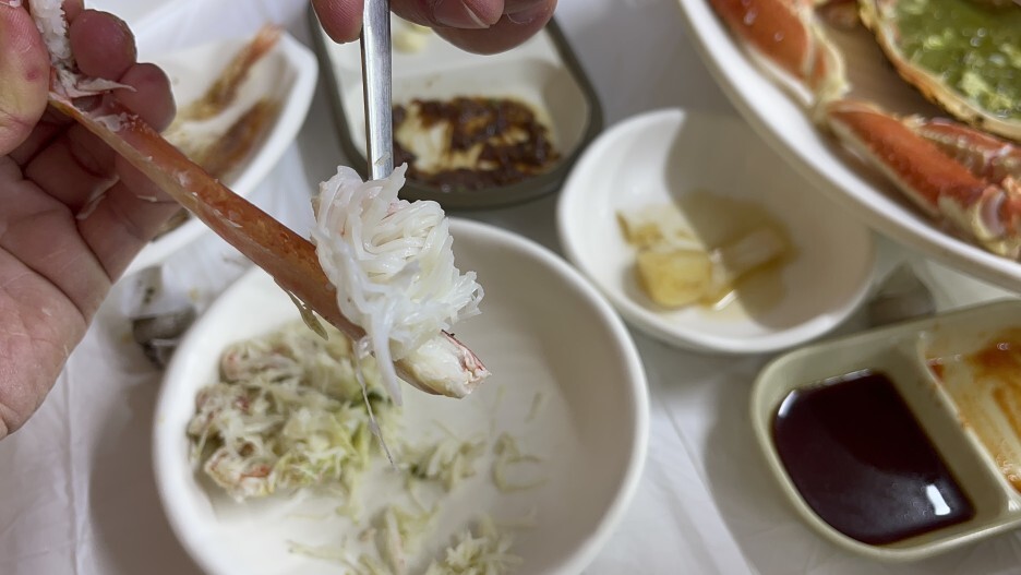하지만 진정한 주인공은 마지막에 나오는 법! 바로 집게! 살이 껍질모양 그대로 꽉 차있다. 모든 부위가 맛있긴 했지만.. 압권은 집게다! 뜨끈뜨끈하고 대게의 감칠맛이 압축되어 있는 게살의 정점! 이순간을 얼마나 기다렸던가.. 입안으로 사르르 녹아들어가는 순간이 영원했으면 싶은 마음과 함께 입안가득 게살향이 감돈다. 너무 맛있다.. 백개 정도 먹을 수 있다면 지금 죽어도 여한이 없을 맛이다.