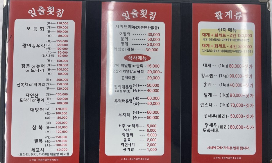 아주 깔끔하게 정리되어 있는 주문진 횟집 일출횟집 메뉴판. 오늘은 연휴동안 고생하신 부모님을 위한 날이니만큼 모둠회와 대게까지 총출동하는 날이다.