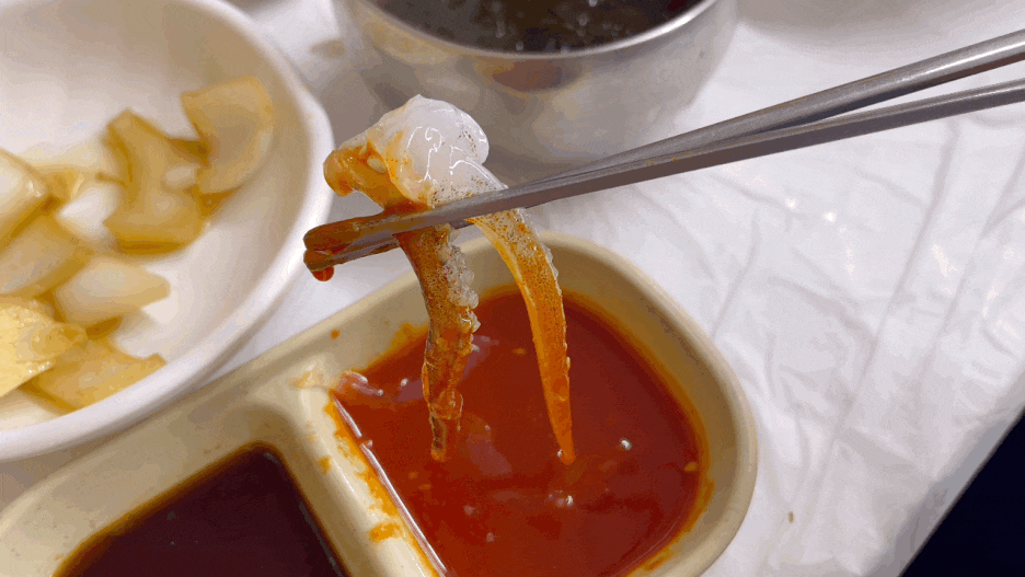 먼저 오징어회부터 시식! 다리가 꿈틀거릴 정도로 신선함이 살아있다. 산오징어라 맛이 없을 수 없다!