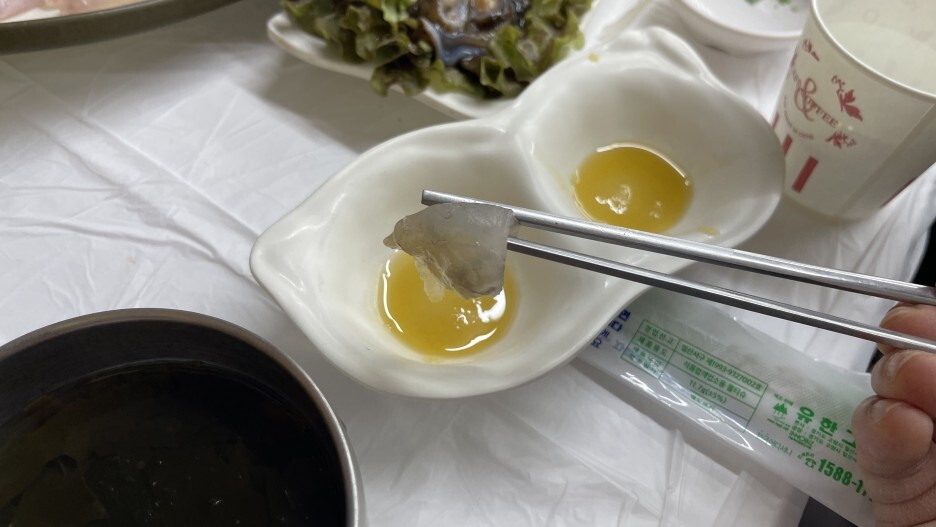 복어회 먹는 꿀팁! 복어회는 소금장에 찍어먹으면 훨씬 맛있다고 한다. 혹시나 나오지 않았다면 반드시 소금장을 달라고 요청해야 한다. 간장 No! 초장 No! 소금장 Yes!