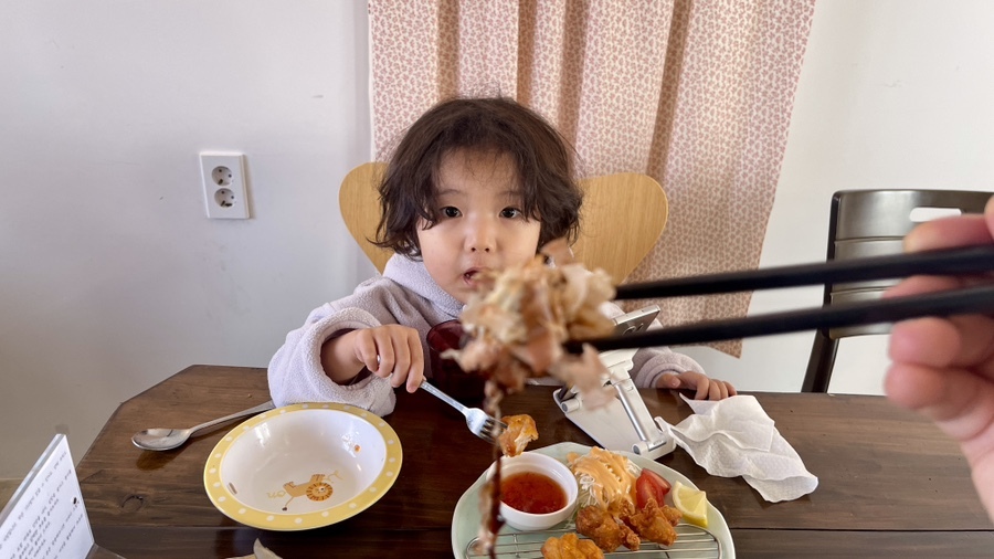 그런데.. 요녀석.. 치킨가라아게를 한입 맛보더니... 다른 음식은 아주 멀리한다. 얼마 전 회전초밥집에서 맛본 멘보샤의 그 소스와 같은 맛이 난다며 칠리소스에 찍어먹는게 너무 맛있다고 아주 난리...