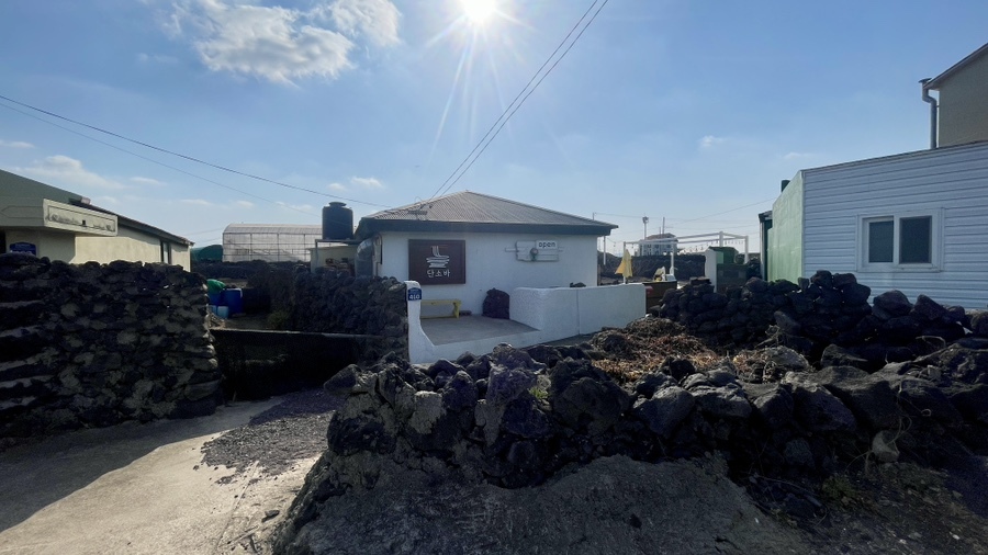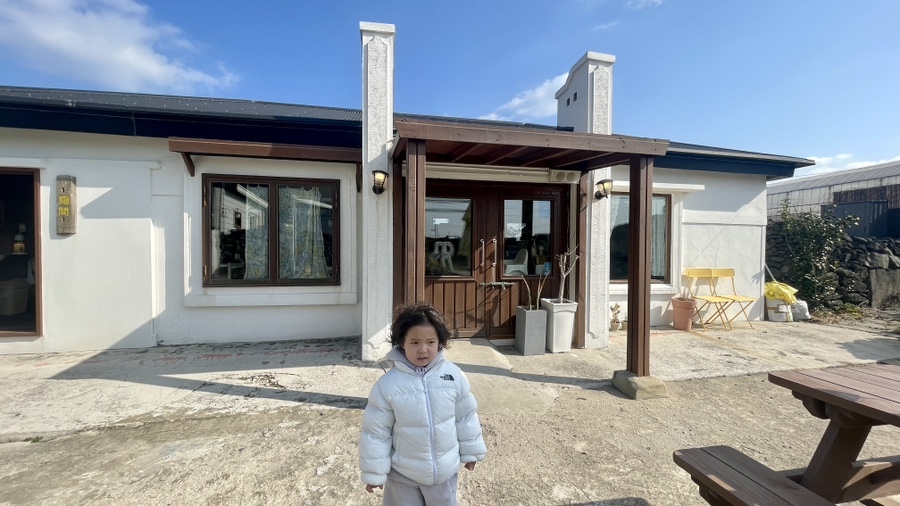 본인도 쌀쌀함이 느껴졌는지.. 조금만 놀다가 바로 들어가자고 먼저 나선다. 옛 제주 주택을 개조해서 만든 것인지.. 출입문 앞에 기둥이 아주 제주스럽다.