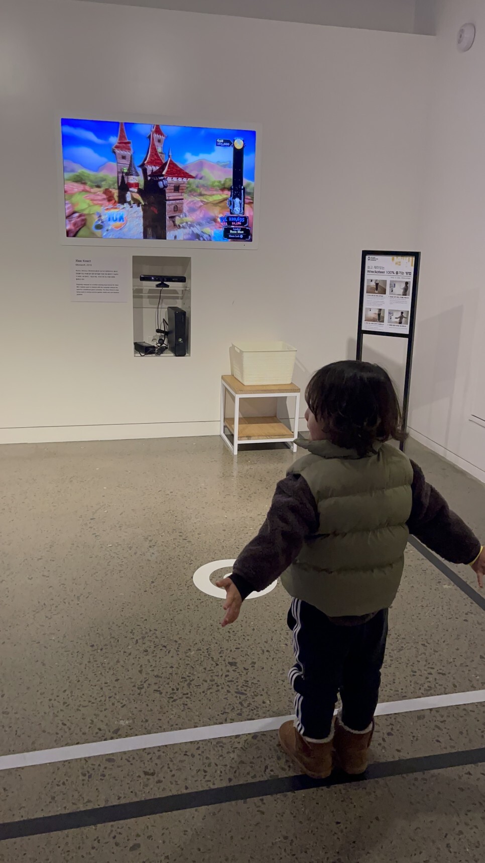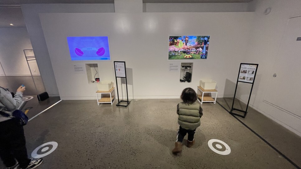 2층 입구 바로 옆엔 증강현실 게임기가 설치되어 있어 직접 체험해볼 수 있다. 방법을 살짝 알려주었더니 곧잘 따라하며 해보는 녀석. 요리조리 몸을 움직여가며 게임하는 재미에 한동안 빠져버린다.