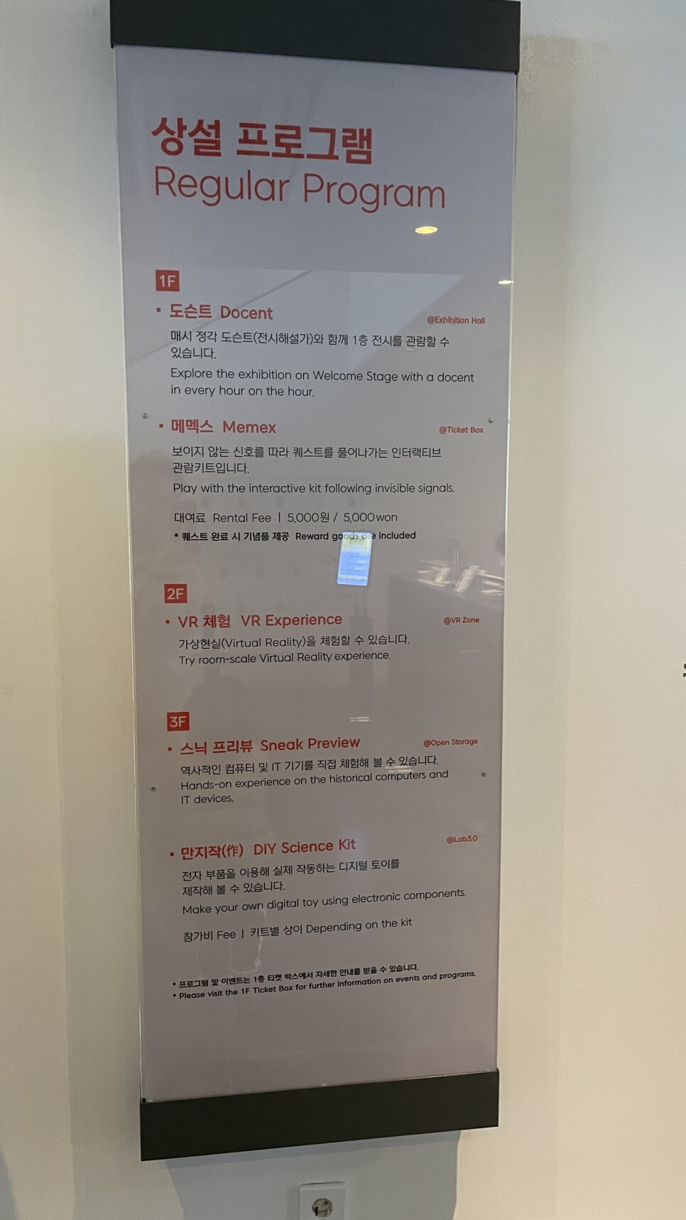 관람 프로그램은 무료/유료 두가지로 구성되어 있는데, 초등학생 이상이면 웬만한 유료프로그램은 참여가능해 보인다. 아이들에게 유익한 시간을 위해서 좋은데, 라온이와 같은 유아들이 체험하기엔 약간 무리가 있어보여 우리는 무료프로그램 위주로만 관람하기로 했다.