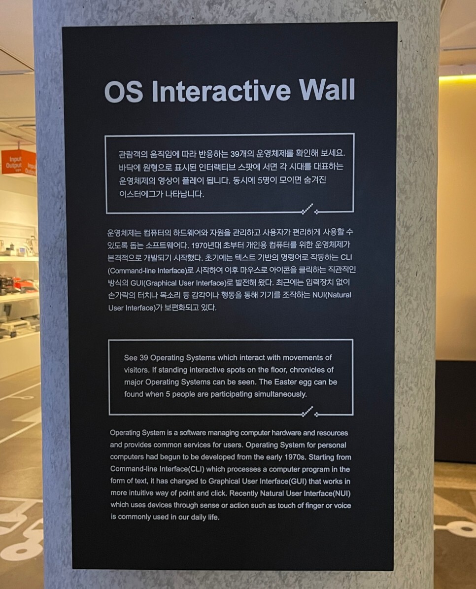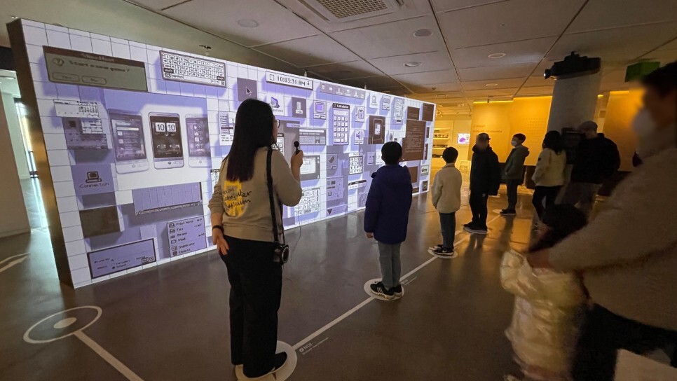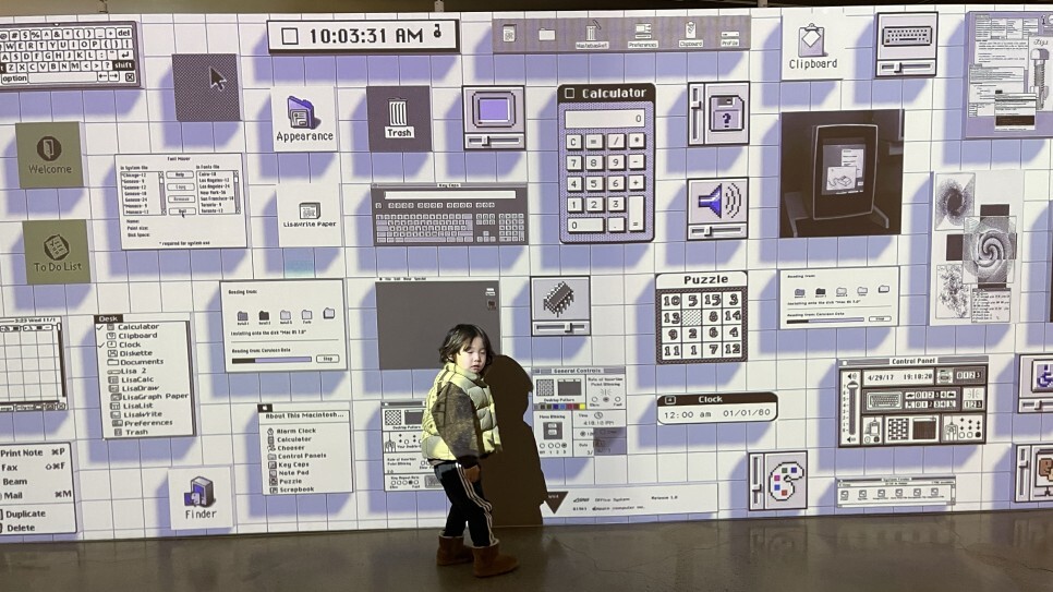 하드웨어 뿐만아니라 지금까지 쓰이던 운영체제의 변천사도 미디어아트를 통해 살펴볼 수 있다. 영상 앞에 놓여져 있는 동그라미를 밟을 때마다 해당 운영체제의 모습이 영상에 투영되어 나온다. 아이들이 재미있어 할만한 요소이다. 그냥 보기만 했다면, 알 수 없는 이 신박함은 도슨트의 설명 덕분에 알 수 있게 되었다. 그리고 바닥에 마련된 동그란 모양의 버튼을 모두 밟게 되면, 아주 특별한(?) 영상이 나오는데, 궁금증을 위해 이것은 직접 방문하면 볼 수 있도록 남겨두고자 한다.