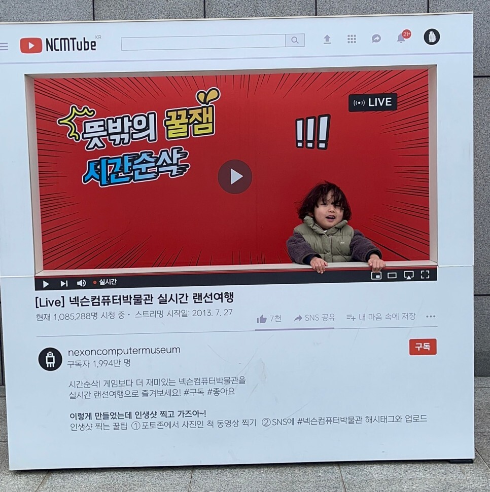 주차장 한켠에 마련되어 있는 유튜브 포토존. 익숙한 화면이 반가운지 올라가서는 "Ladies and gentlemen~" 이라고 이야기 하는데 기특하기도 하고..놀랍기도 하고... 장꾸미 넘치는 녀석은 자기가 아빠라며 너스레 떠는 모습을 보여준다.