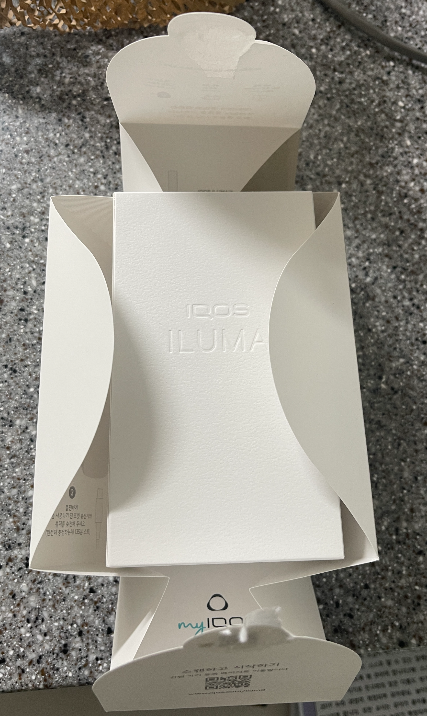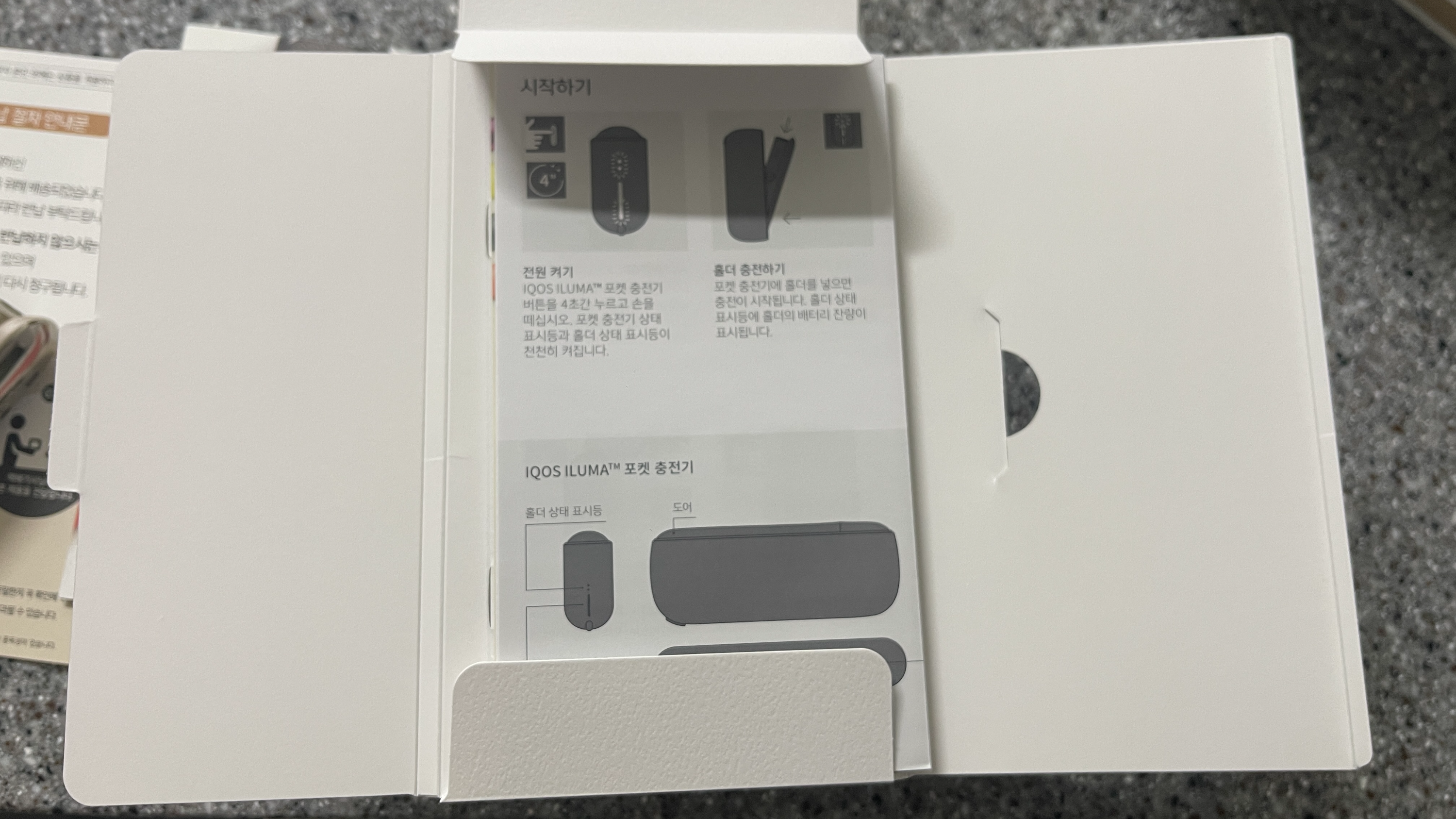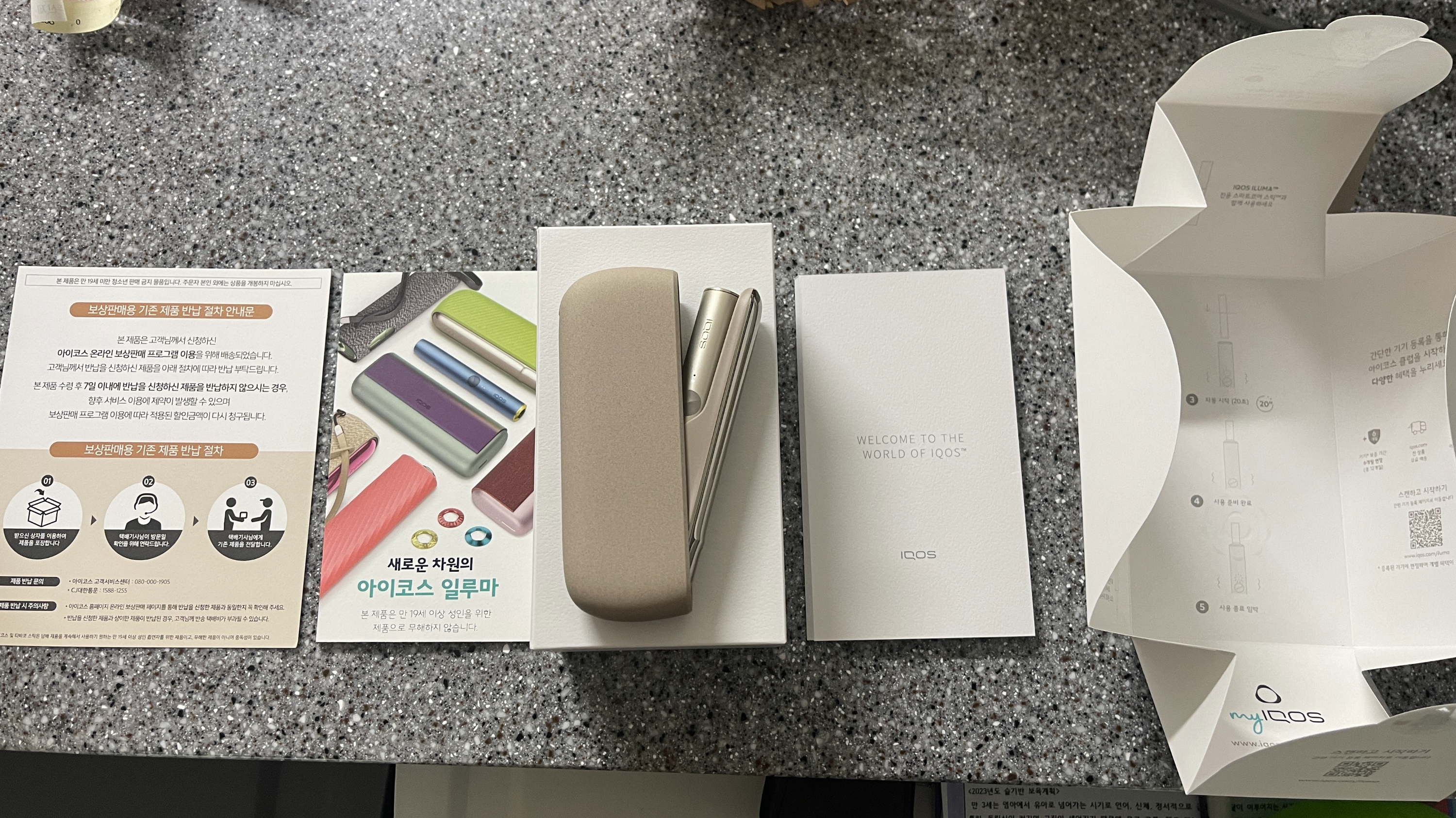 일루마 원도 있고 프라임도 있는데, 원은 너무 실용성이 떨어질 것 같고, 프라임은 쓰잘데기없이 고급져서 별로고.. 그래서 딱 중간쯤인 아이코스일루마로 선택. 포장을 뜯어보니 보상판매 반납절차와 설명서 그리고 일루마 박스가 들어있다.