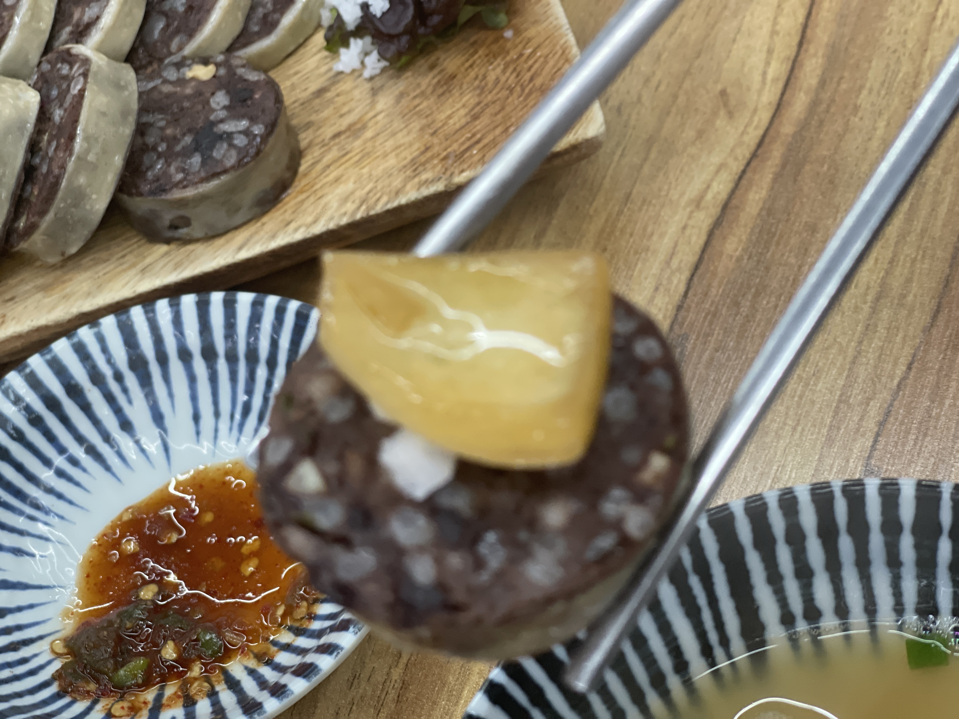 막창순대를 좋아하지만, 누린내가 나는 집에 가면, 입맛버리기 일쑤인데, 잡내를 정말 잘잡았다. 쫀득한 막창안에 푸짐하게 속을 채워넣어 한입크기로 알맞게 썰어내어 먹기도 좋고, 입안가득 풍미가 작렬한다. 꽃소금을 올려서 먹어도 좋고, 맛간장에 찍어먹어도 좋고, 양파장아찌를 올려서 먹어도 좋고.. 어떻게 먹어도 맛있는 맛. 막창순대만으로도 이미 아라동맛집이고 직장인맛집이다. 국수와의 찰떡궁합은 당연지사!