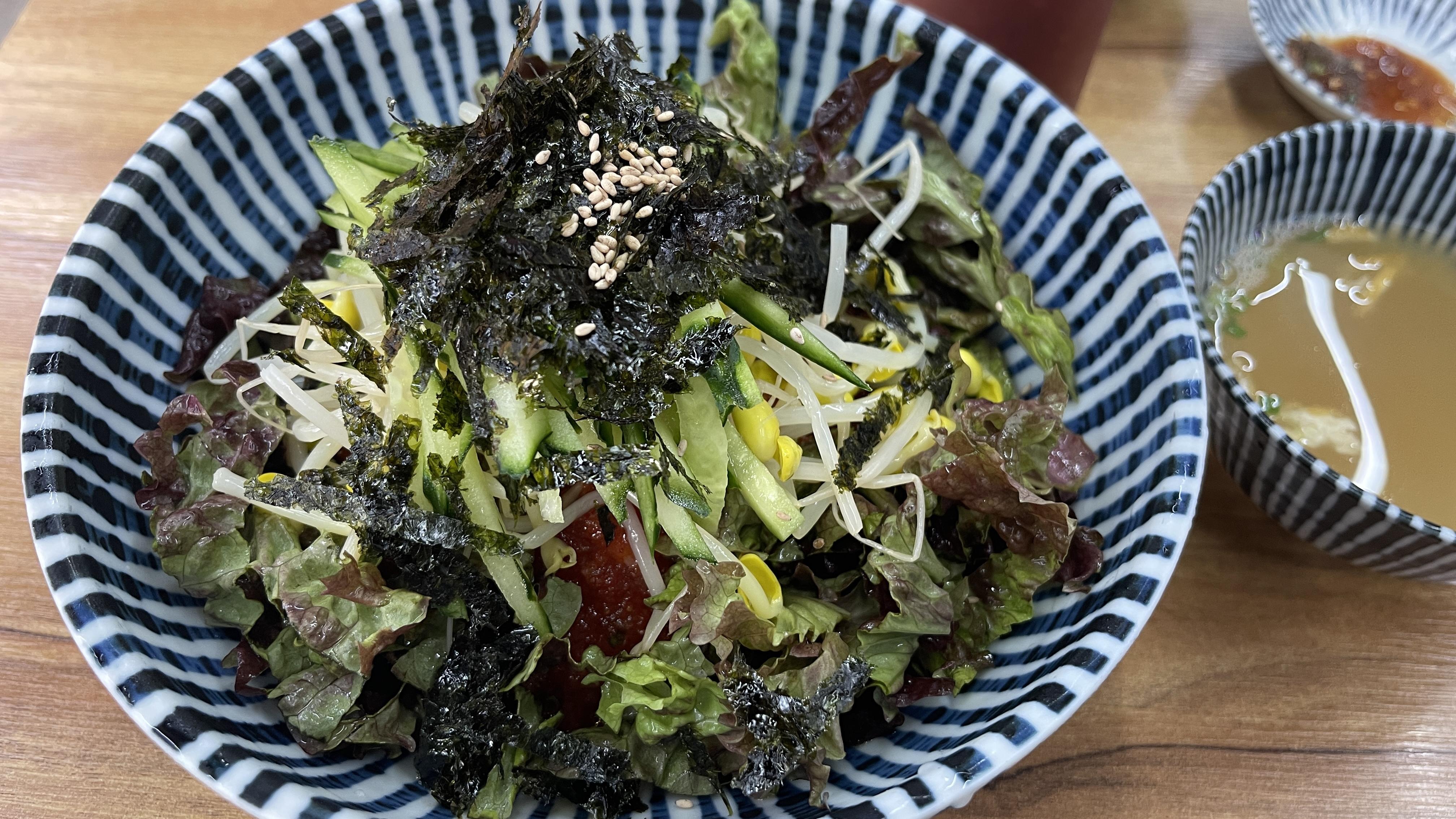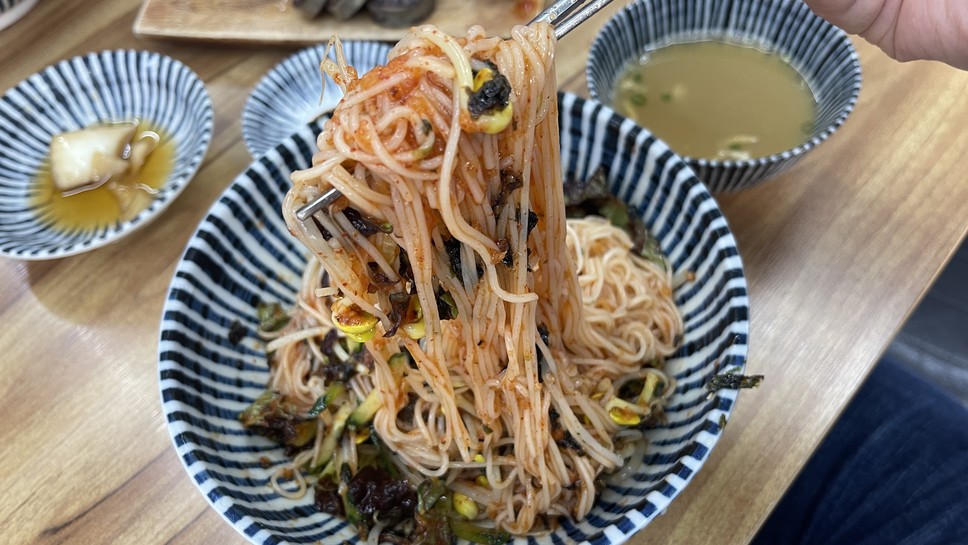 새콤달콤이 아닌, 새콤짭쪼름하다는 표현을 쓴 것은 아무래도 내가 양념장 조절에 실패한 이유일 것 같다. 곱배기를 시킨 탓에 먹어보지도 않고, 미리 양념장을 추가하여 비볐더니, 약간 짜졌다. 짭쪼름한 맛이 있긴 하지만, 역시는 역시. 비빔국수가 맛이 없을 수가 없다. 아삭한 채소와 콩나물이 비빔국수의 식감도 좋게해주고, 처음부터 끝까지 맛있다. 같이 나오는 멸치육수를 중간중간 먹어주면, 입안도 개운하게 해주어 계속이고 먹을 수 있을 것 같다. 내가 먹는 것을 유심히 지켜보셨는지.. 주방실장님이 나오셔서 "사리 추가해 드릴까요?"라고 물었다. 짧은 순간동안 달라고할까말까로 고민을 하다가, 사양했다. 지금 고삐를 풀어버리면 다이어트 폭망할 듯 싶으니, 그냥 곱배기로 먹은걸로 만족해야 한다. 더 먹고 싶은 것을 억눌러 참긴 했는데, 이집 너무 착한집 아닌가? 곱배기도 추가요금이 없는데.. 그걸 먹고도 더 주겠다니.. 하.. 국수매니아는 무조건 면아라로 헤쳐모여야 할 판이다.