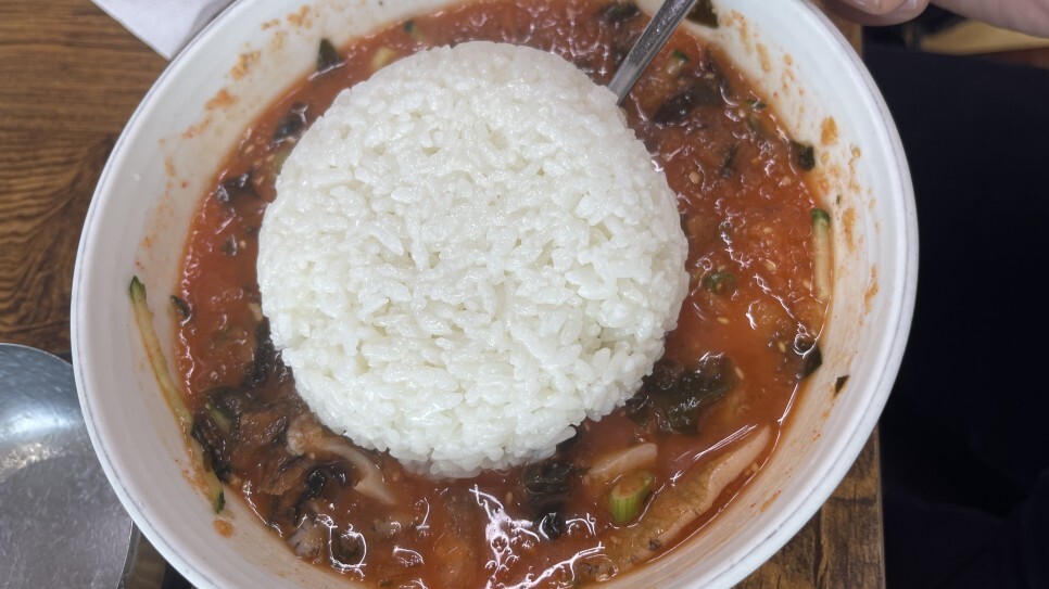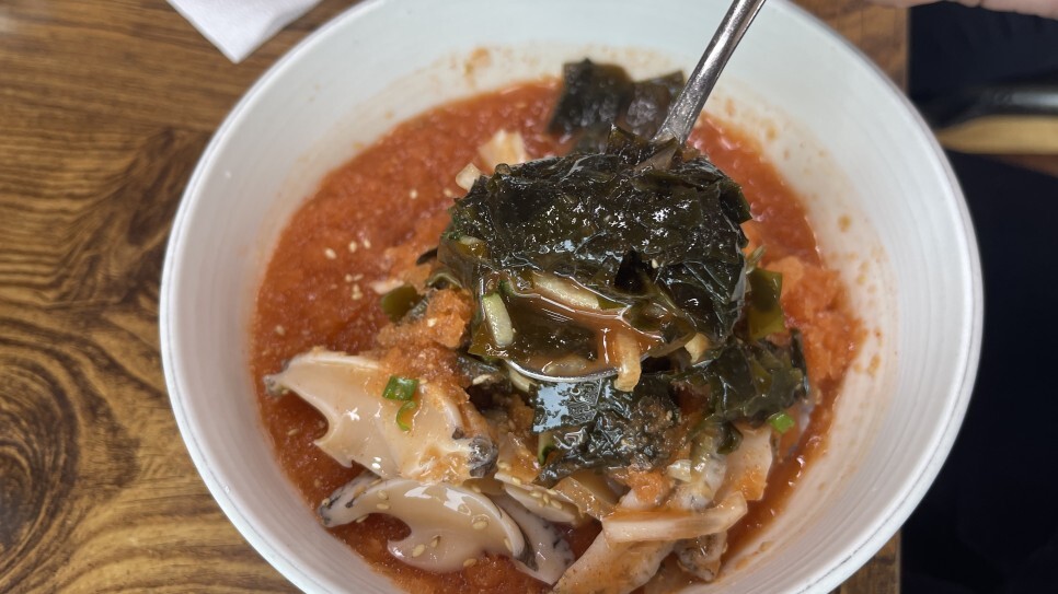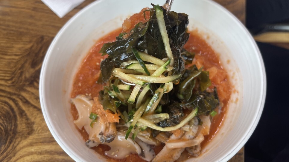 밥을 말기 전 이미 소스의 맛과 전복의 신선함도 알게 되었으니, 본격적으로 밥을 말아보자! 국수사리 한덩어리가 서비스로 나온다면 그야말로 금상첨화이겠지만, 아쉬운대로 밥만 말아먹어보는데... 역시... 이 더위에 차가운 물회밥은 굿굿! 그냥 먹어도 새콤달콤한 소스 덕분에 반찬없이도 맛나게 먹을 수 있지만, 오징어젓갈 올려서 먹어면 더 개꿀맛! 도두봉맛집이다.