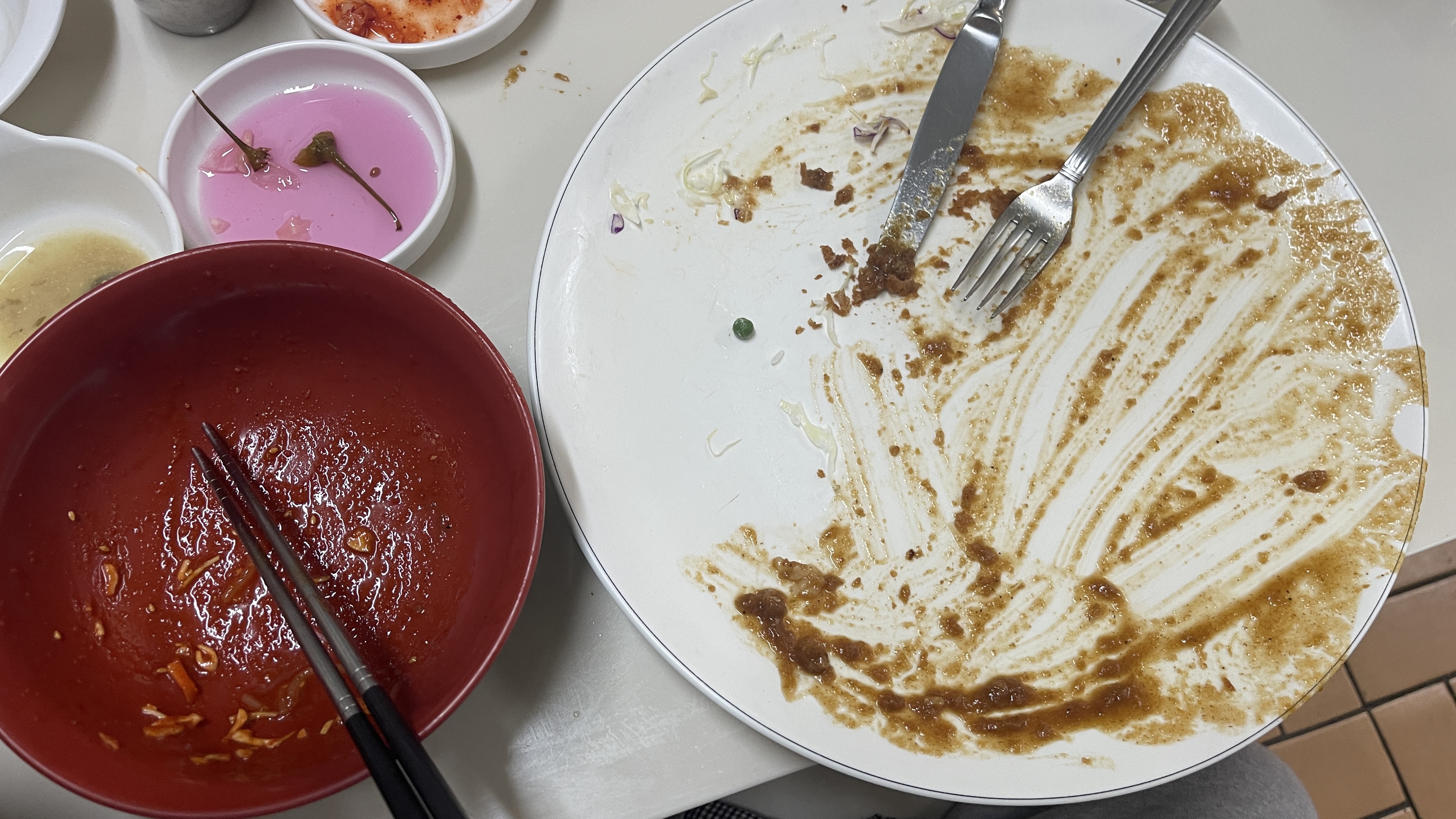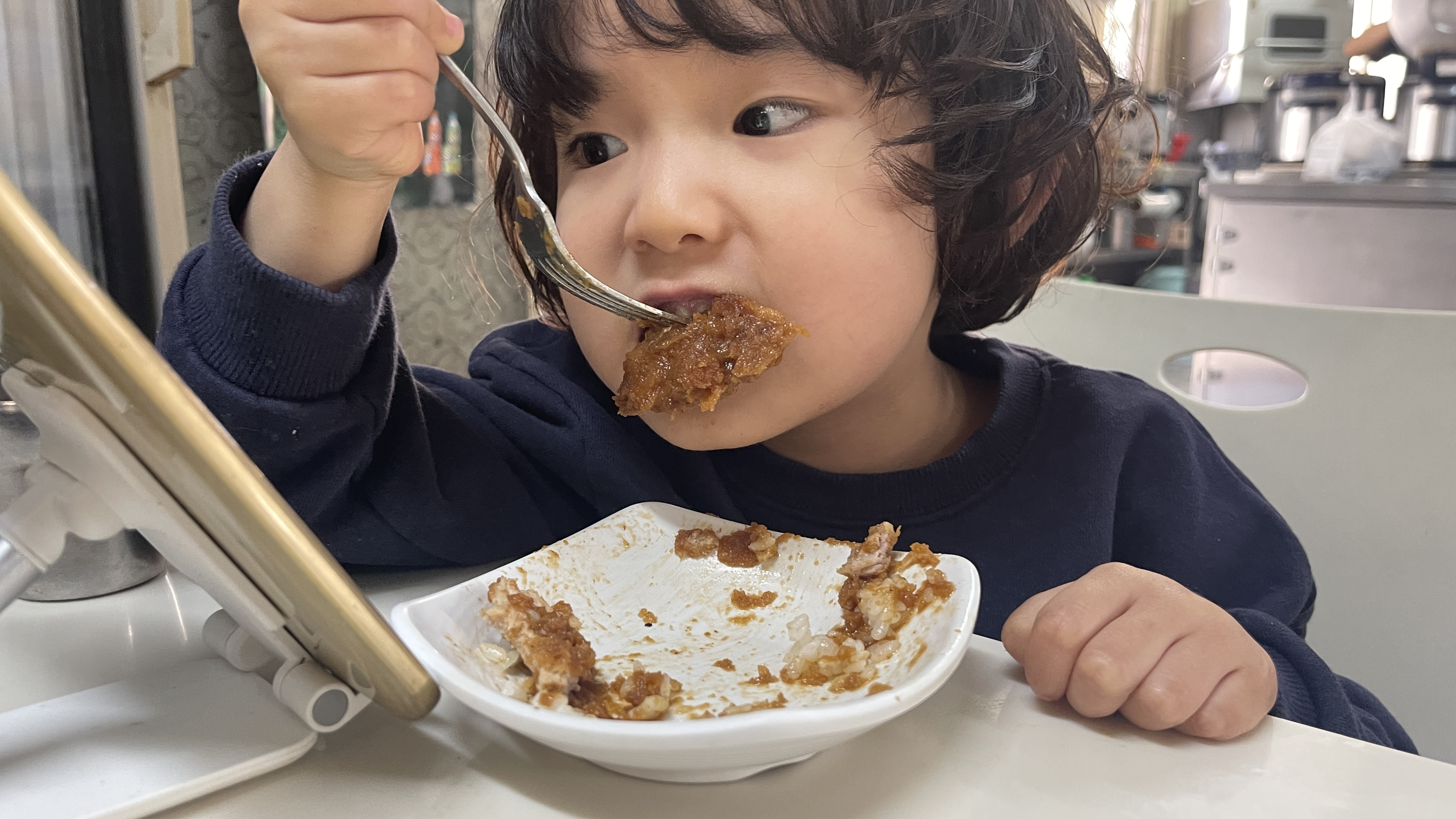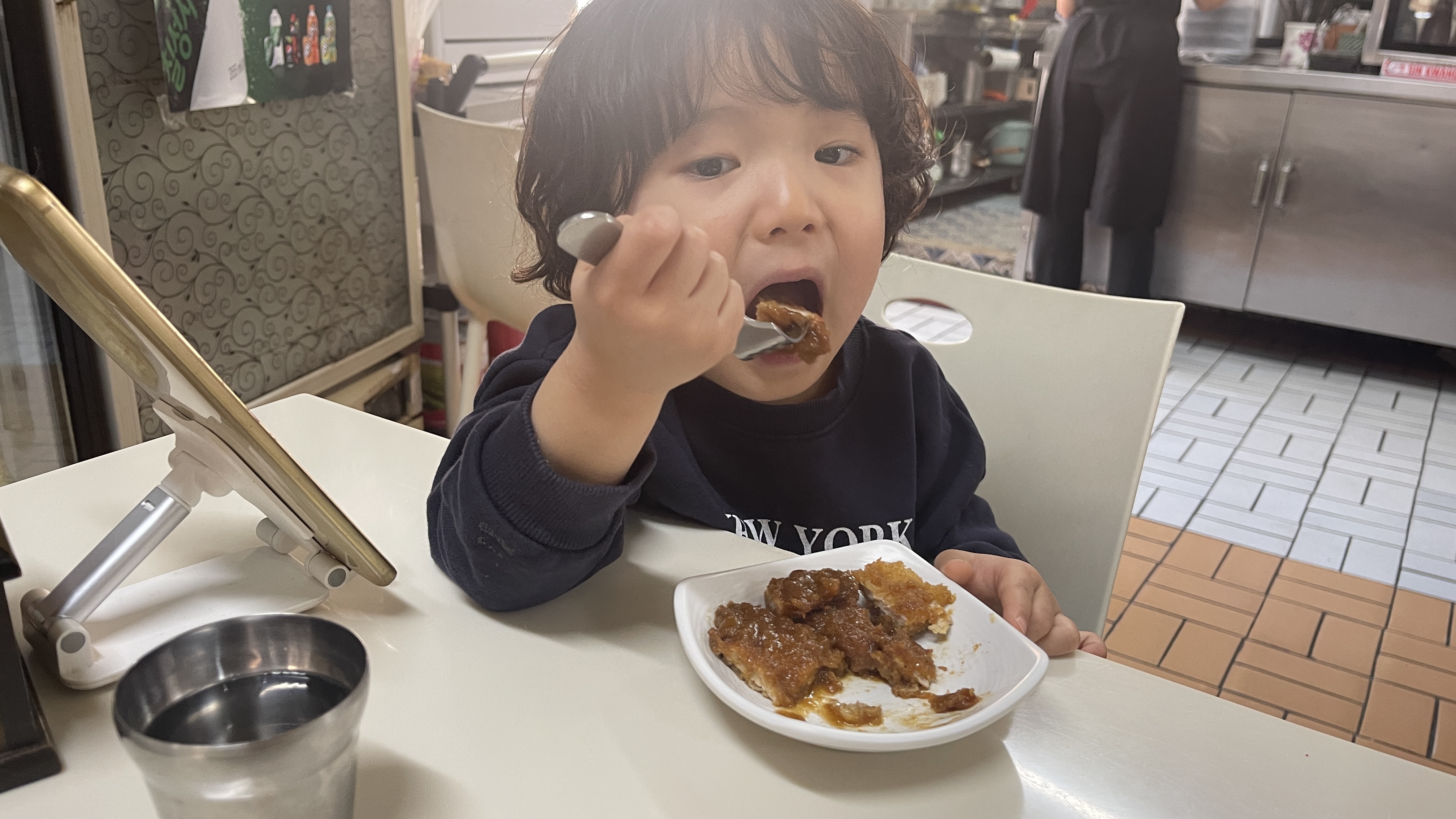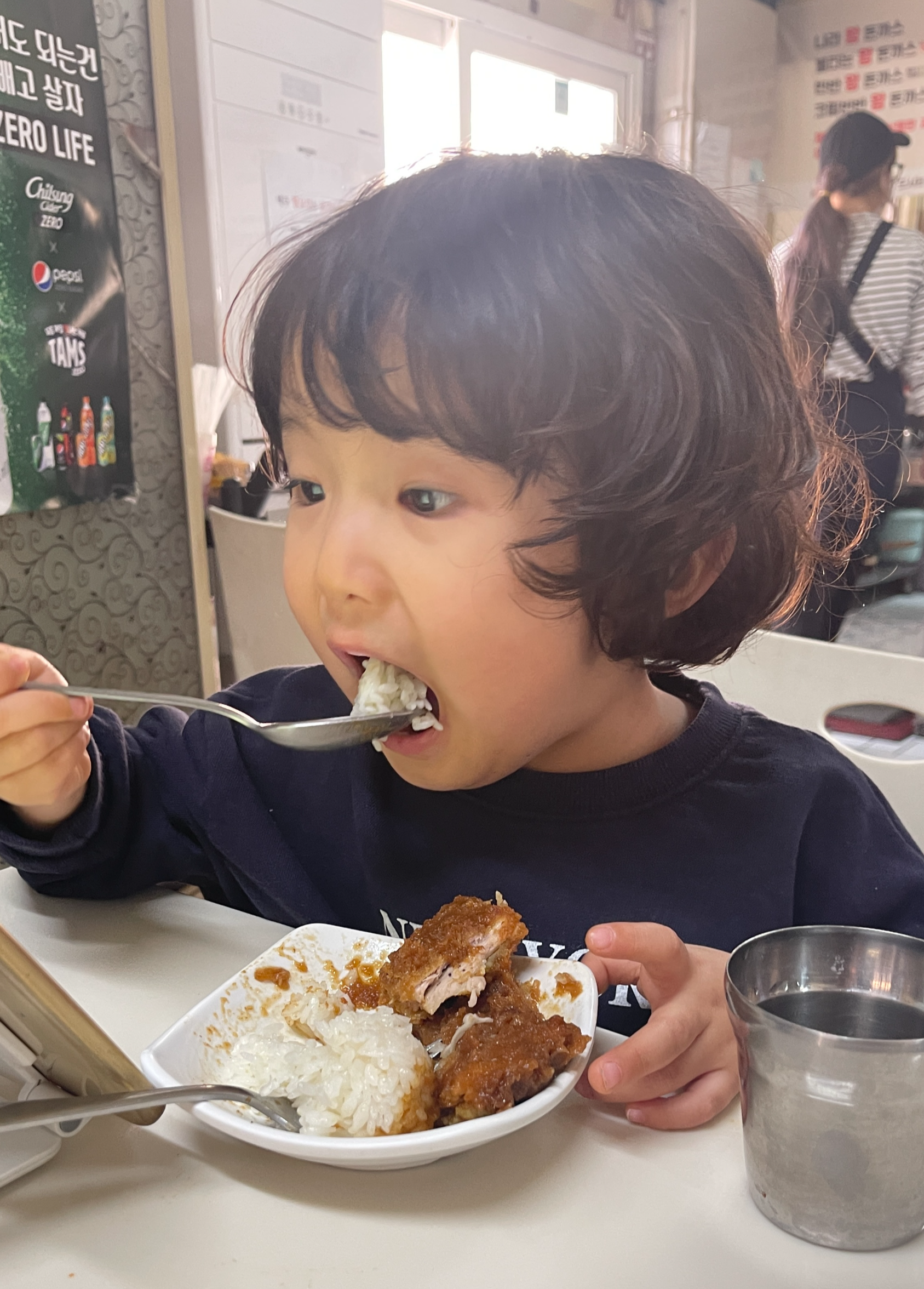 아무래도 똑같은 주문으로 한번 더 시켜야되려나 싶을 정도로 잘 먹는다. 나도 공기밥이랑 같이 좀 먹고 싶었는데.. 밥은 전부 자기꺼라며 절대 양보하지 않는 녀석. 결국 왕돈까스의 절반을 먹어치우고서야 끝난 식사.