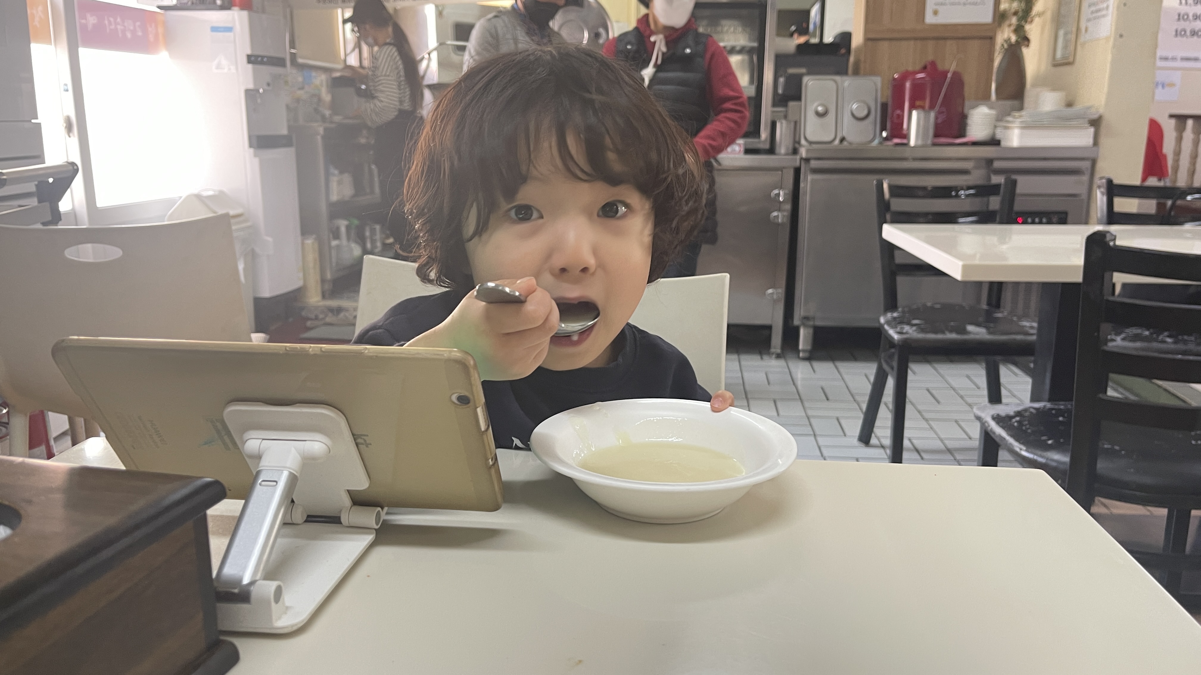 분명히 처음 먹어보는 스프일텐데.. "이게 스프인거야?"라고 물어보더니, 뜨끈뜨끈한 스프를 큰 수저로 듬뿍 퍼서 먹는다. 허허.. 너는 정녕 이제 형아가 되어가는게 맞구나. 안먹던 음식들도 서슴없이 먹다니..