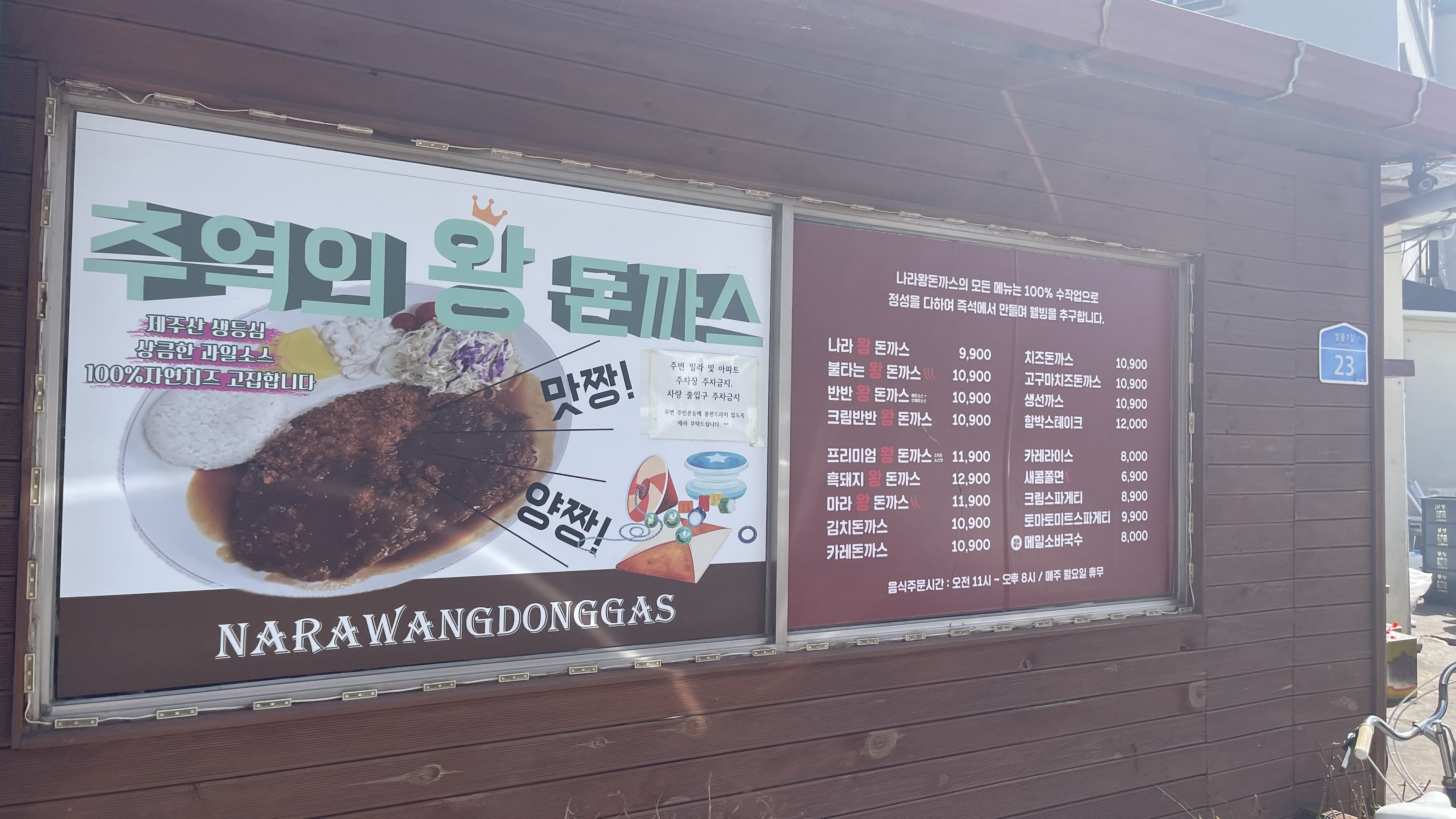 추억의 왕돈까스! 제주산 생등심, 상큼한 과일소스, 100% 자연치즈 고집한다고 한다. 가게 앞에도 메뉴판과 가격이 붙어있는 것이 인상적이다.
