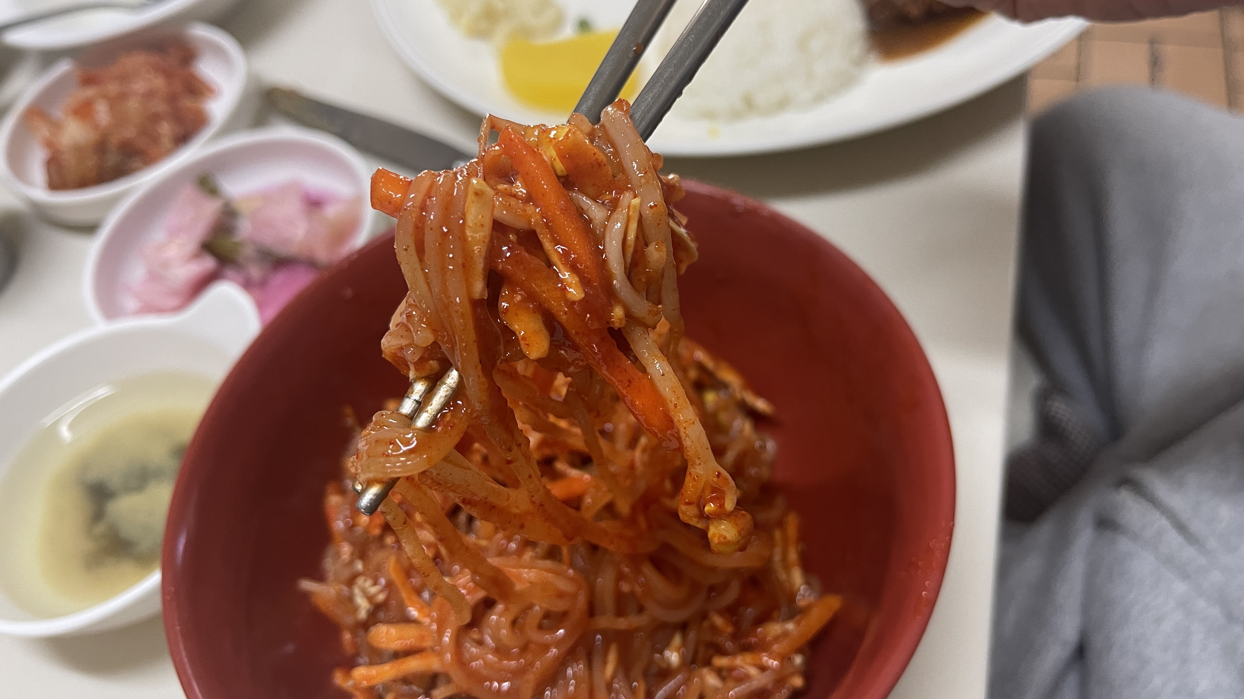 아삭한 콩나물과 당근, 양배추가 과하게 들어있지 않아서 좋고, 그럼에도 불구하고 사각사각 씹히는 식감도 참 좋다. 그런데 이거 은근 매콤하다. 이정도 매콤함이라면 불타는 왕돈까스의 맛도 제법 궁금해진다. 분명 맛있게 매콤할 것 같다.