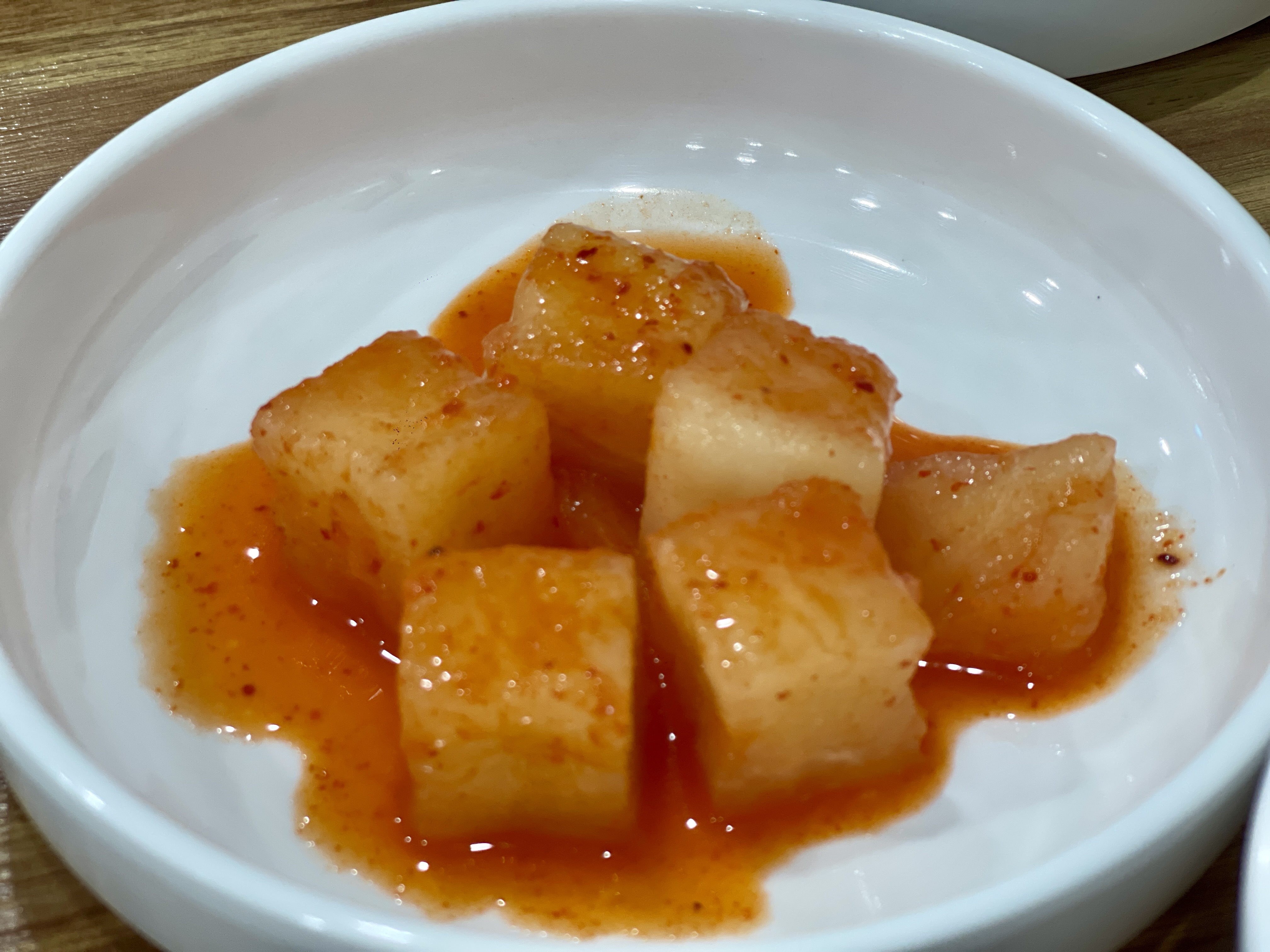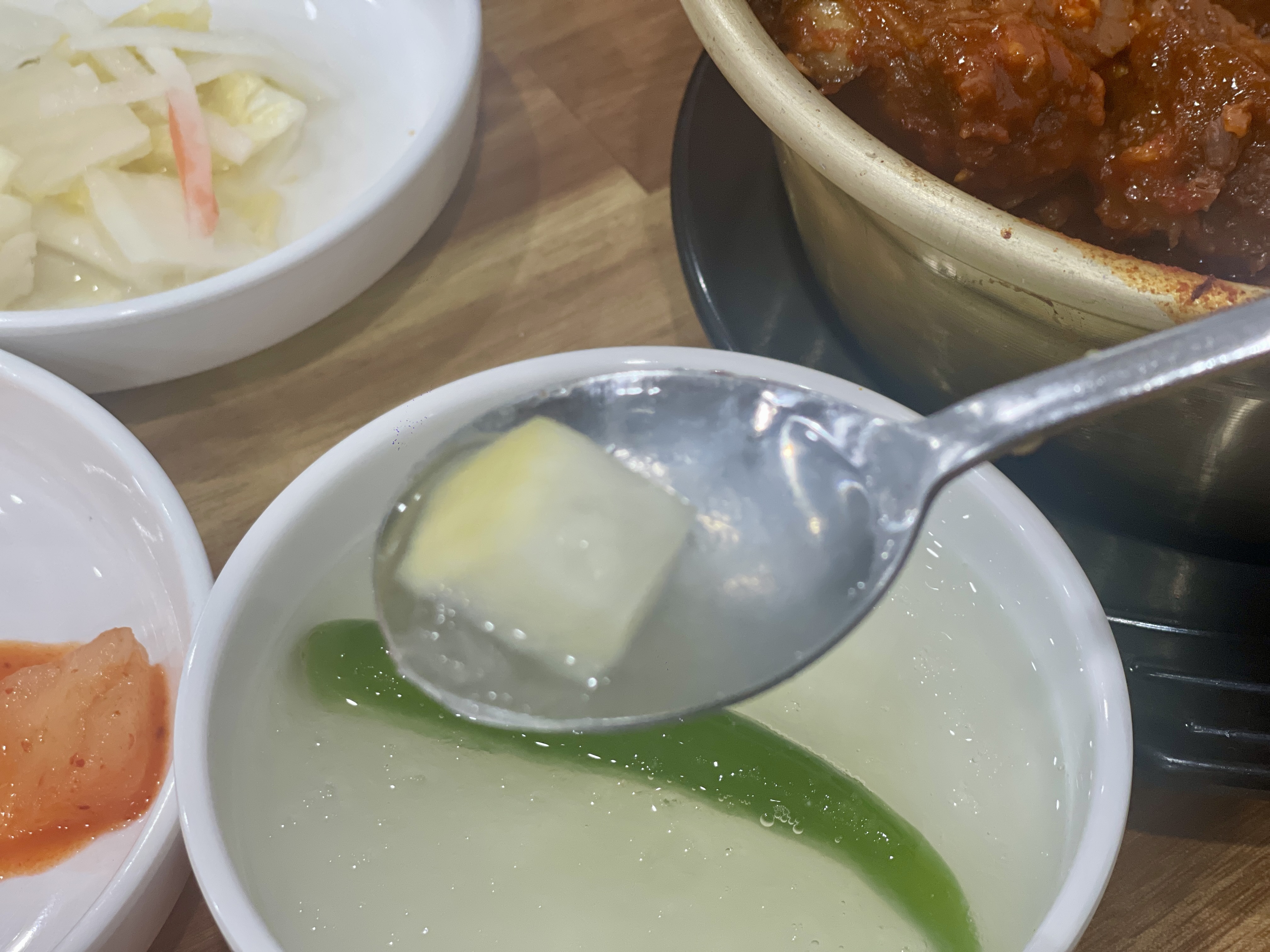 쎈간을 좋아하는 사람이라면, '뭐지?'싶을 정도로 심심한 반찬이다. 깍두기나 백김치는 어느정도 간이되어 있지만, 특히 동치미국물은 소금간을 잊은건가 싶을정도로 밍밍한 시원함이다. 하지만 매운갈비찜과 같이 먹기엔 더할나위없이 좋다. 양념부추와 콩나물 등은 어차피 양념에 넣어 비벼먹을거라 간이 쎌 필요도 없다.