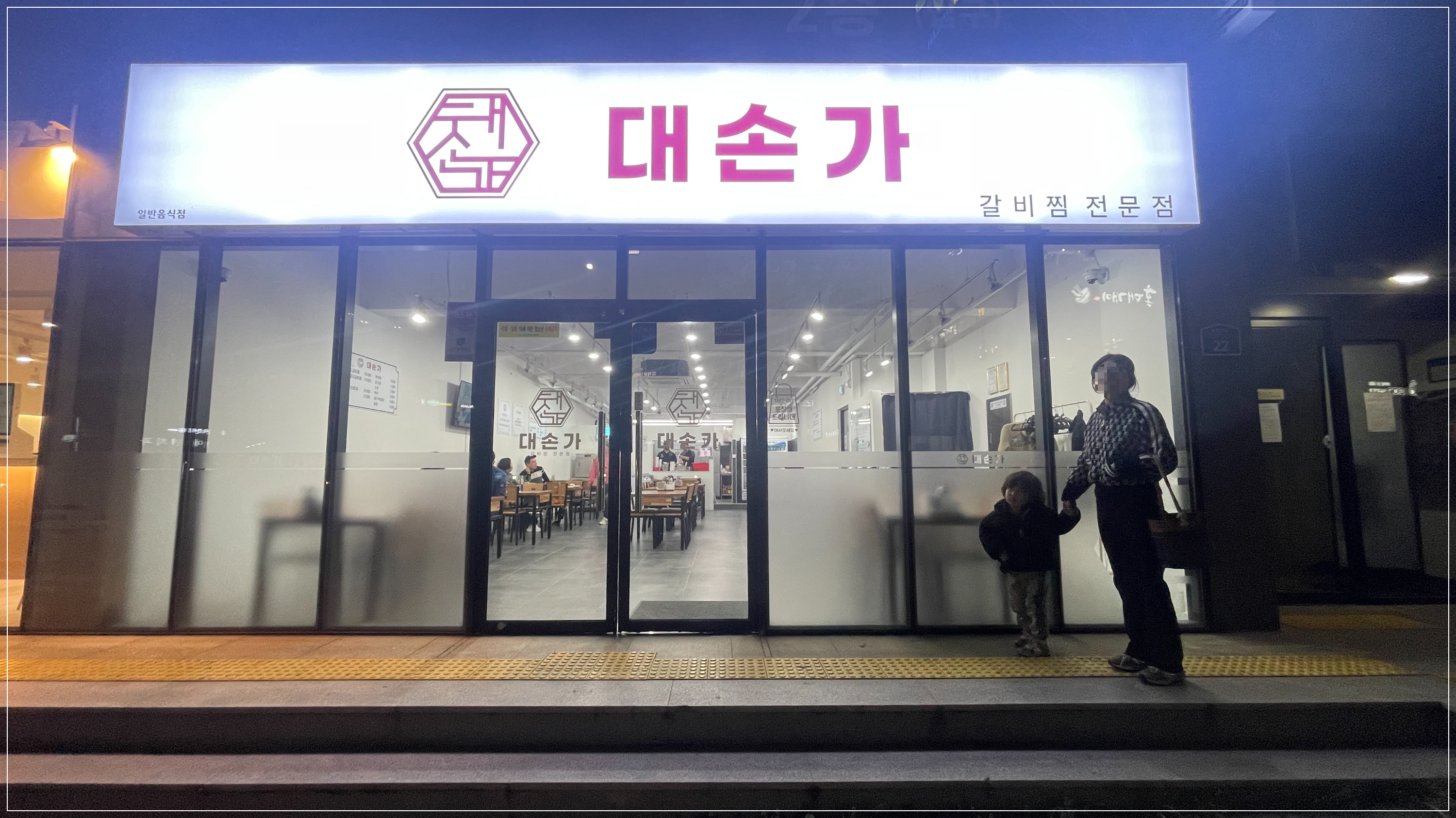 노형동맛집거리에 위치해 있다보니, 주차가 여의치는 않다. 인근에 공영주차장이 많지만, 틈사이를 비집고 겨우 주차한 뒤에 대손가로 향해본다. 그냥 들어가도 되는데... 가게 외부를 찍고 있으려니... 대기 중인 와이프와 라온이.