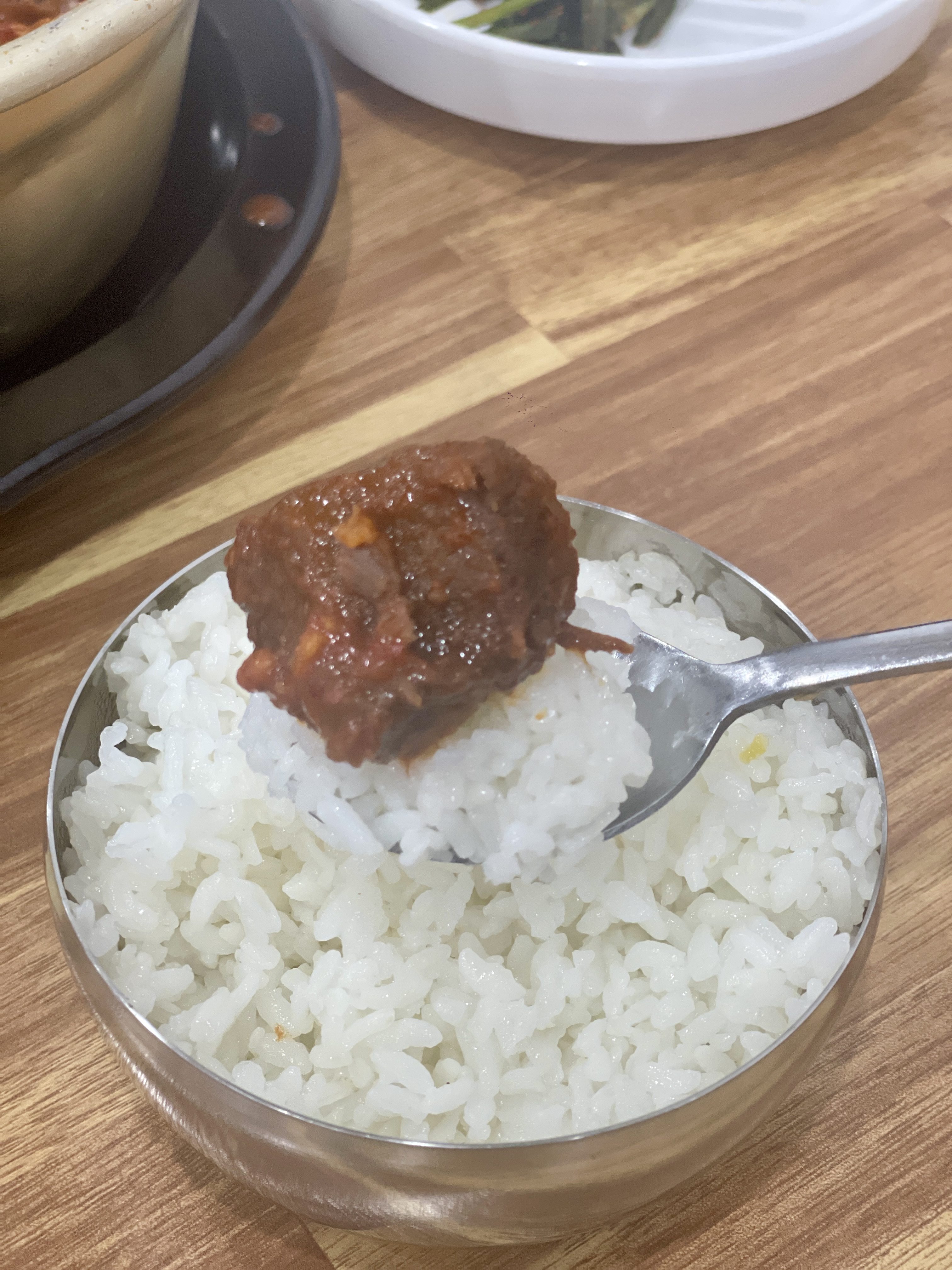 밥위에 하나둘 얹어먹어보니, 저세상 부드러움이다. 육질이 질겼으면 고기를 양보하는 와이프가 혼자서 열심히 먹는다. 부드러워서 먹기 좋다는 얘기다. 나도 질세라 흡입모드. 첫맛이 그렇게 매운건 아니지만, 뒤로 매콤함이 스물스물 올라온다. 맵찔이가 먹으면 무조건 매운맛! 우리에겐 적당한 매콤함이다.