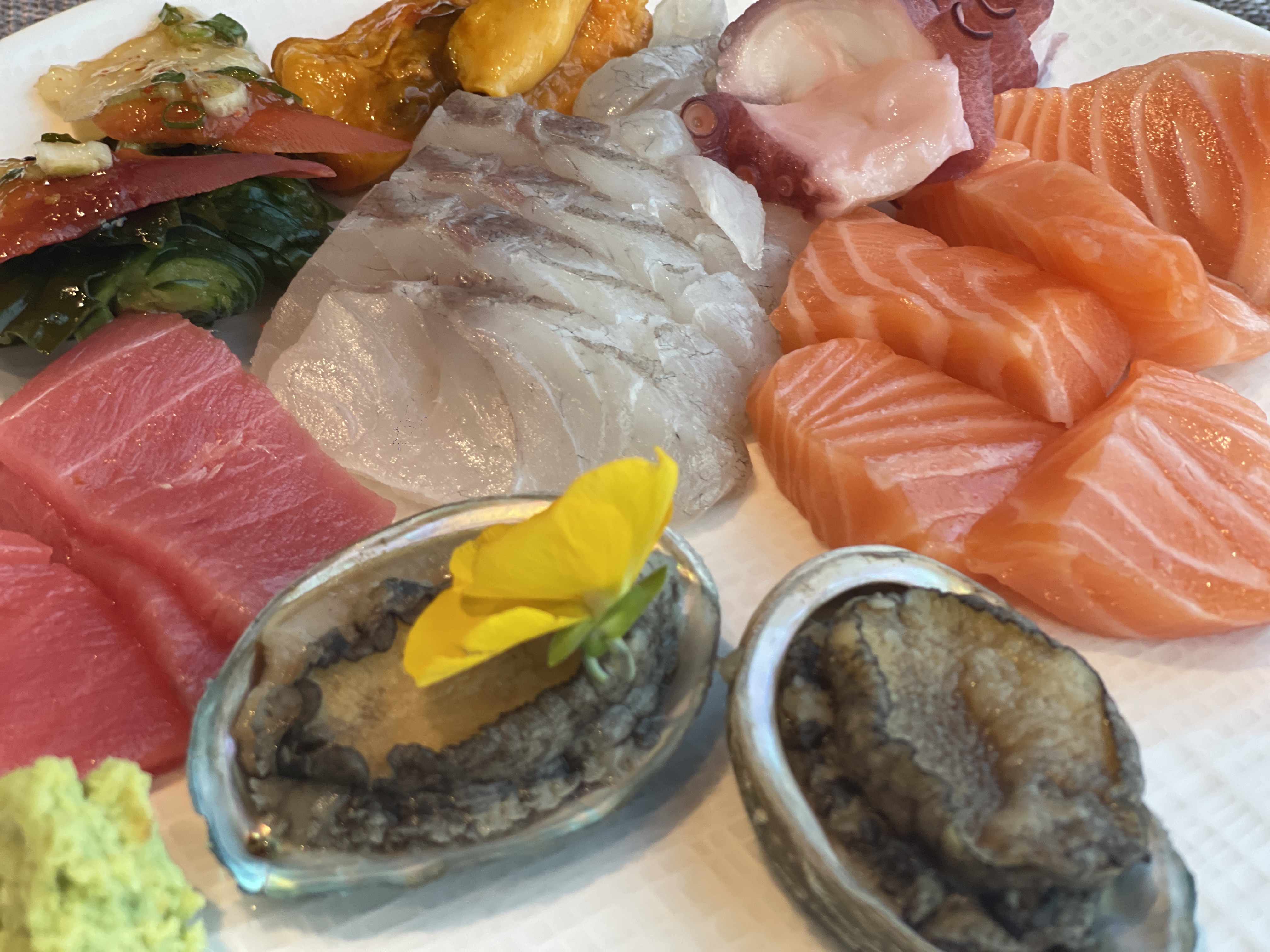 회는 초장에 찍어야 제맛인줄 알지만, 이렇게 호텔뷔페에서 사치를 부릴 때면, 고추냉이 올려 간장에 찍어먹는 방법을 고수하기도 한다. 지금 타임엔 이런식으로 먹으며 회 본연의 맛을 제대로 느끼는 것이 좋다. 시간이 조금 지난 뒤엔 초장의 힘을 빌어 먹는게 굿!