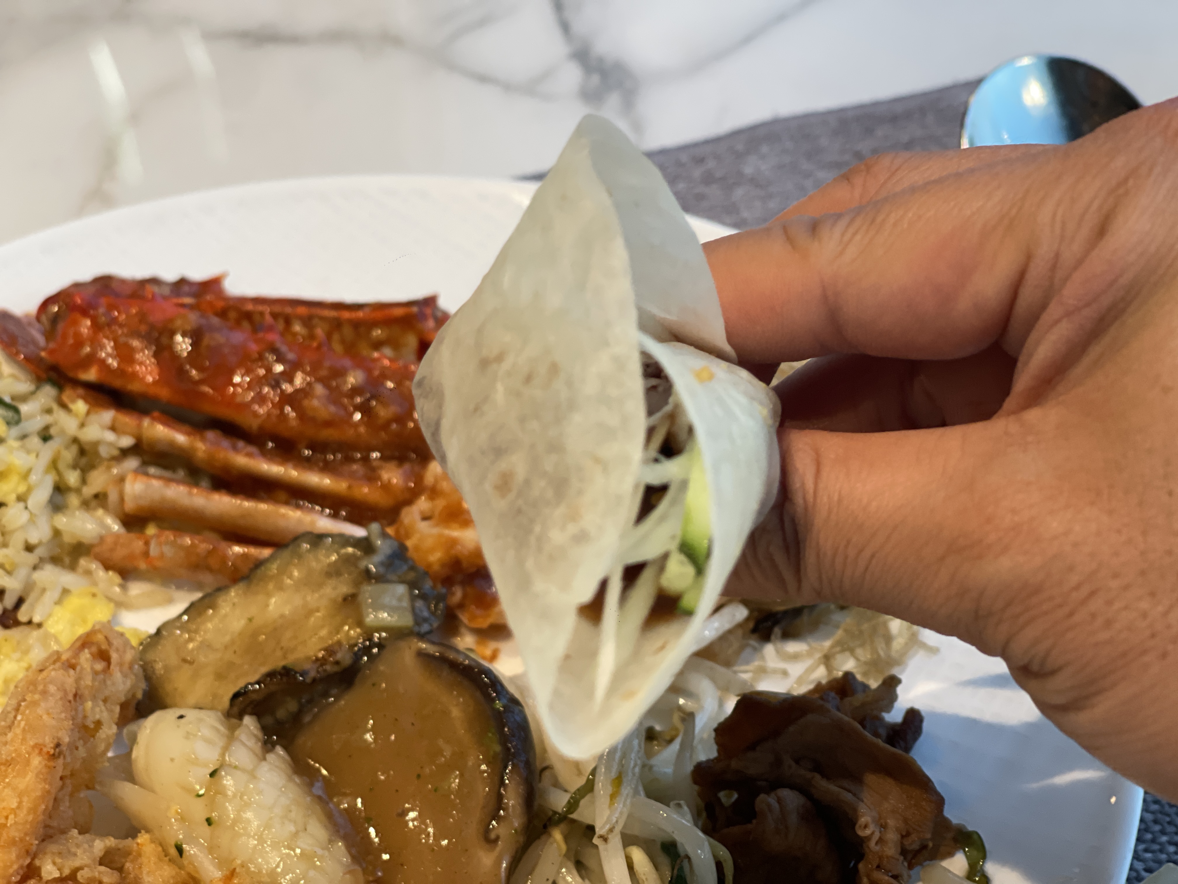 베이징덕쌈을 전에 한번 먹어본 뒤론 호텔뷔페에 있는 경우 무조건 먹어보는 메뉴가 되었다. 온더플레이트 베이징덕쌈도 일품이다!