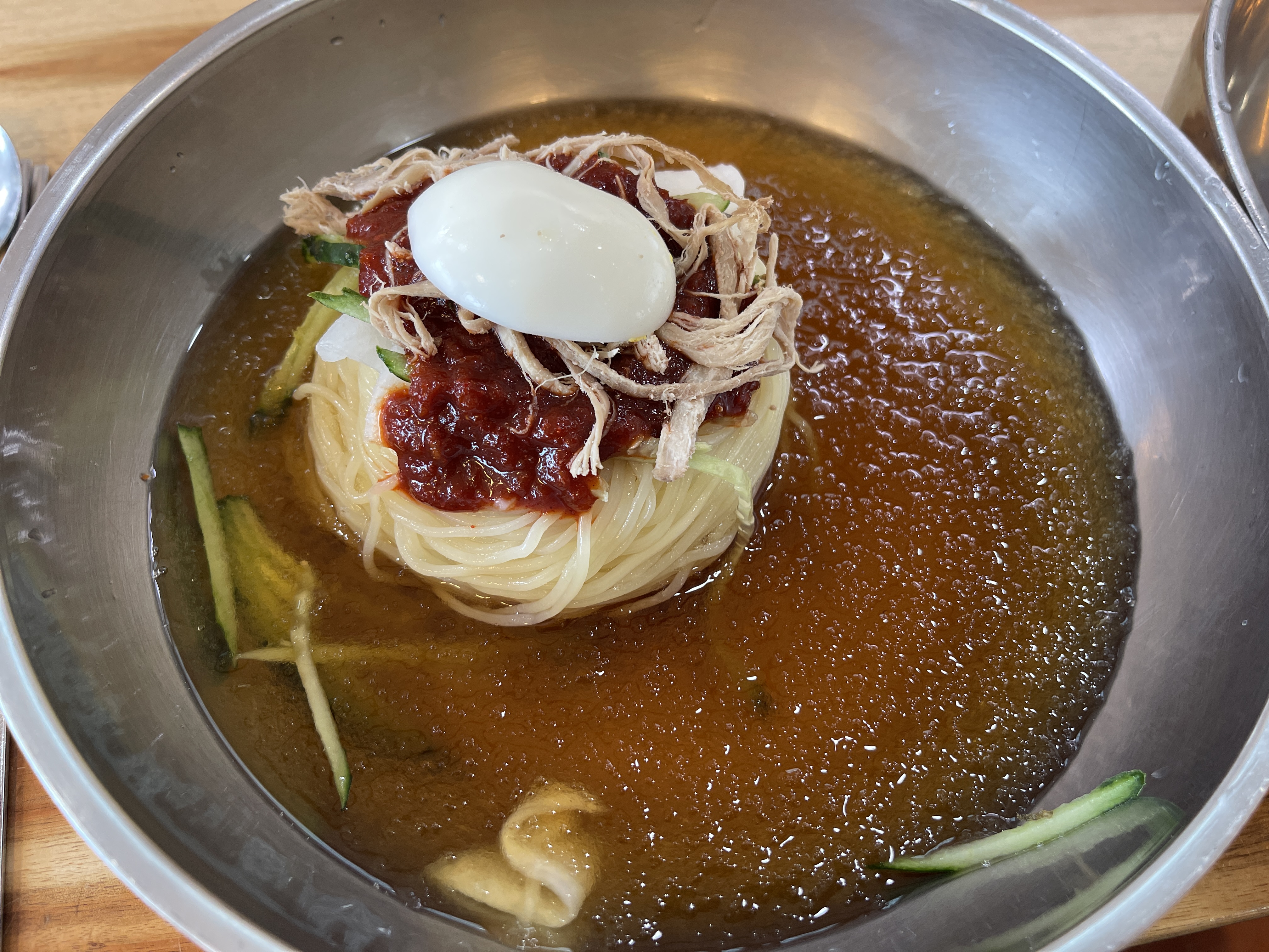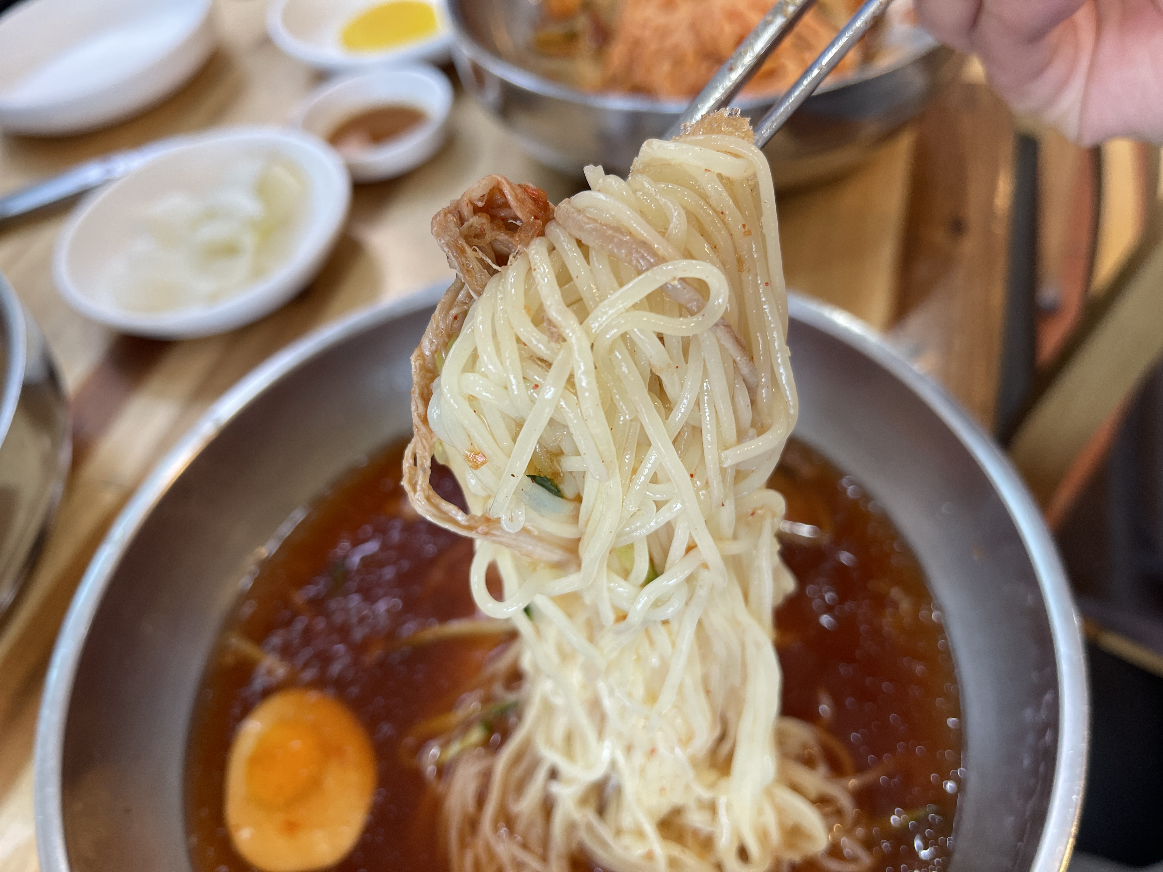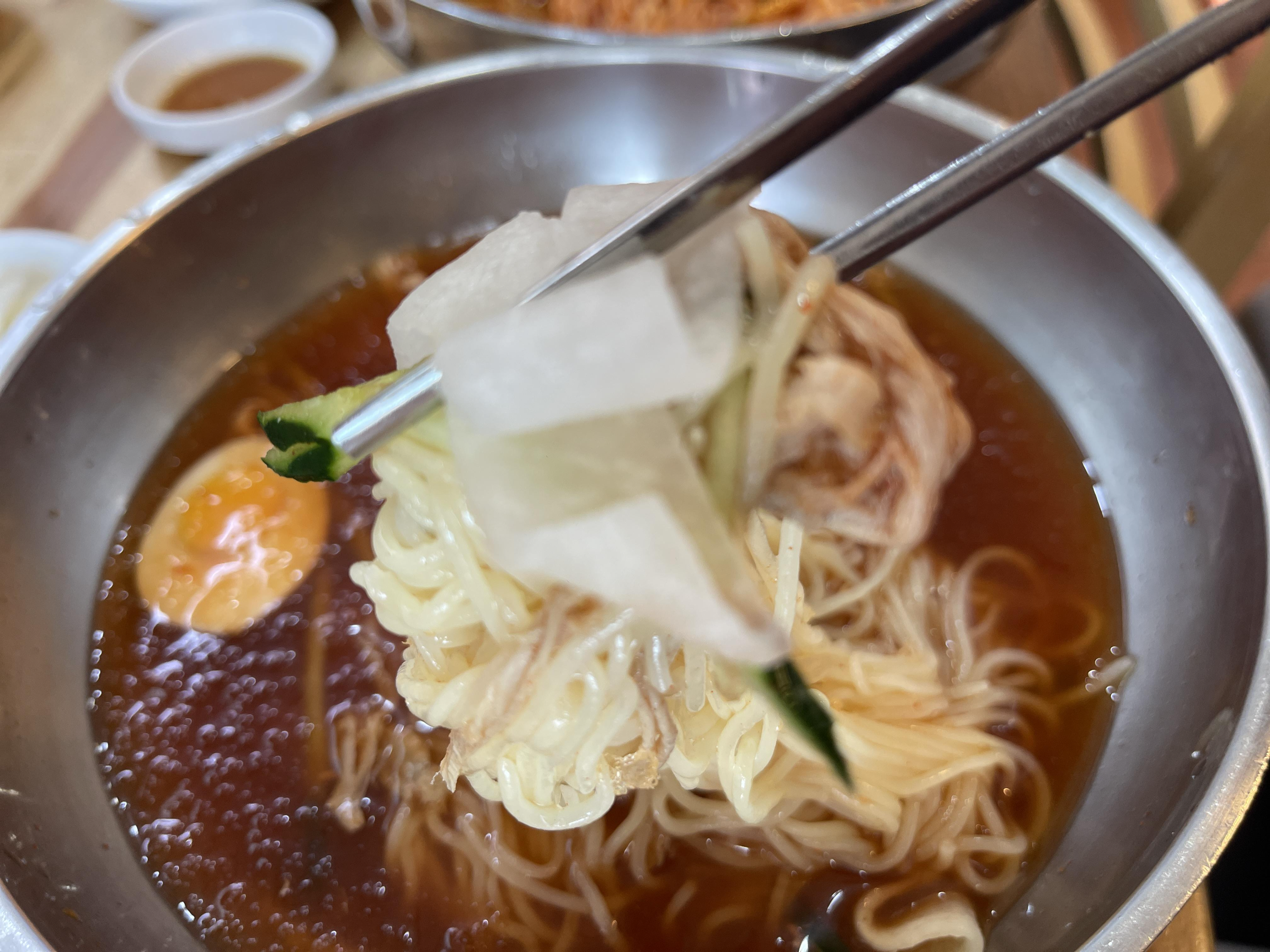 몸에 좋은 건 전부 때려넣고 푹 끓였다는 육수. 진한 국물이 육수맛의 깊이를 대변해주는 것 같다. 시원한 육수 한모금 들이키면.. 오... 좋다 좋아. 부산에서 처음 물밀면을 먹을 때만해도.. 무슨맛인건가 싶던 시절도 있었는데.. 지금은 익숙해져서인지 면의 식감과 육수 모두 만족하게 되었다.