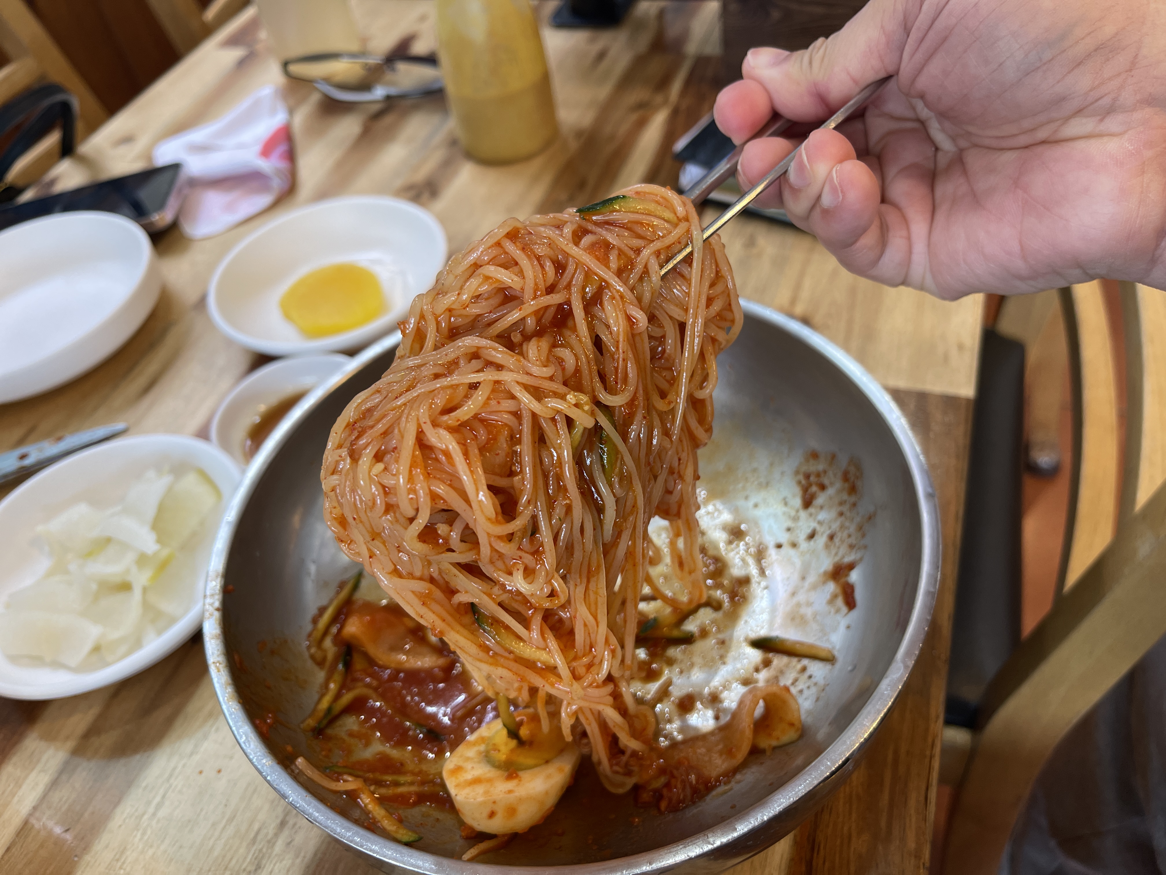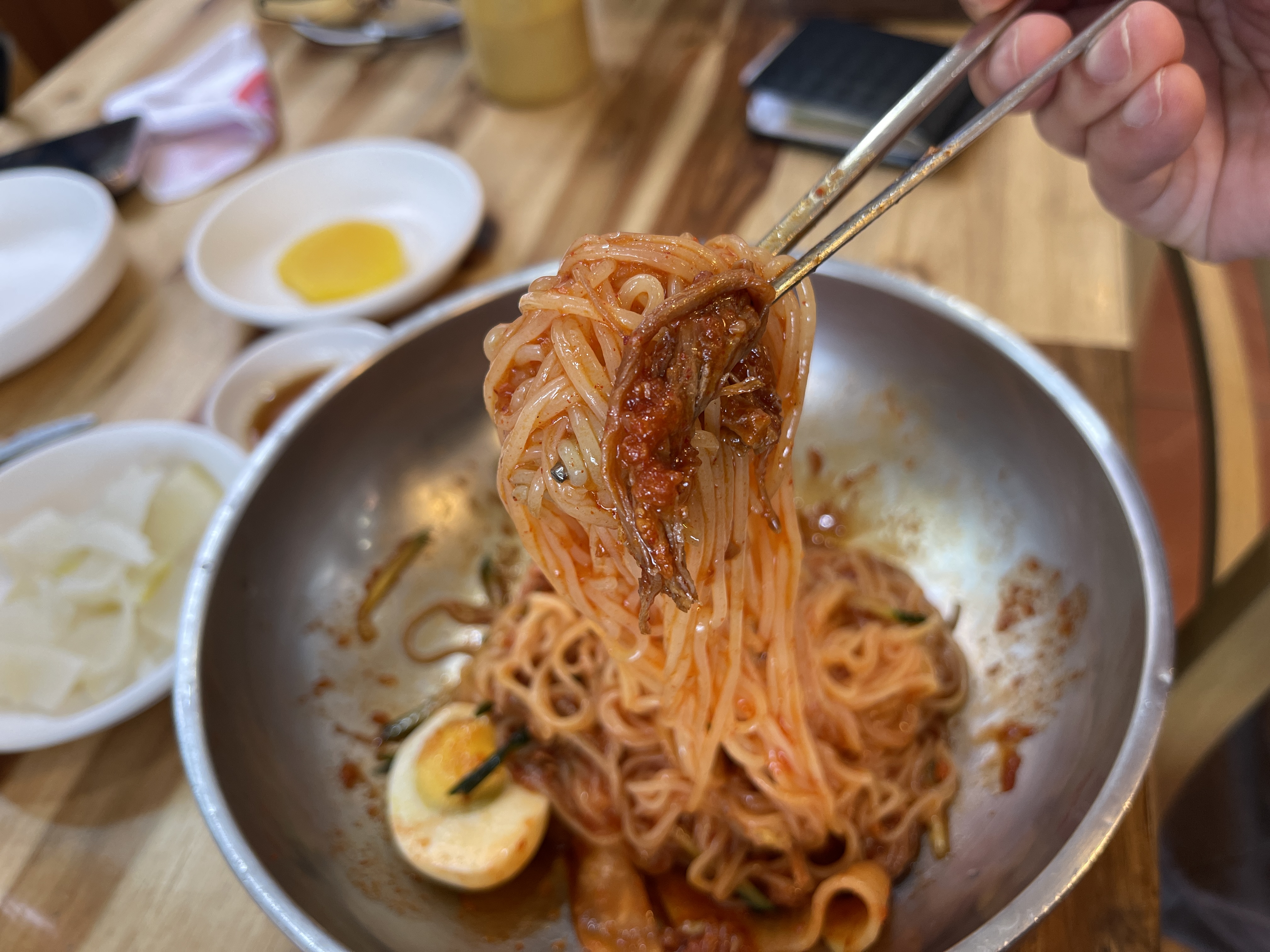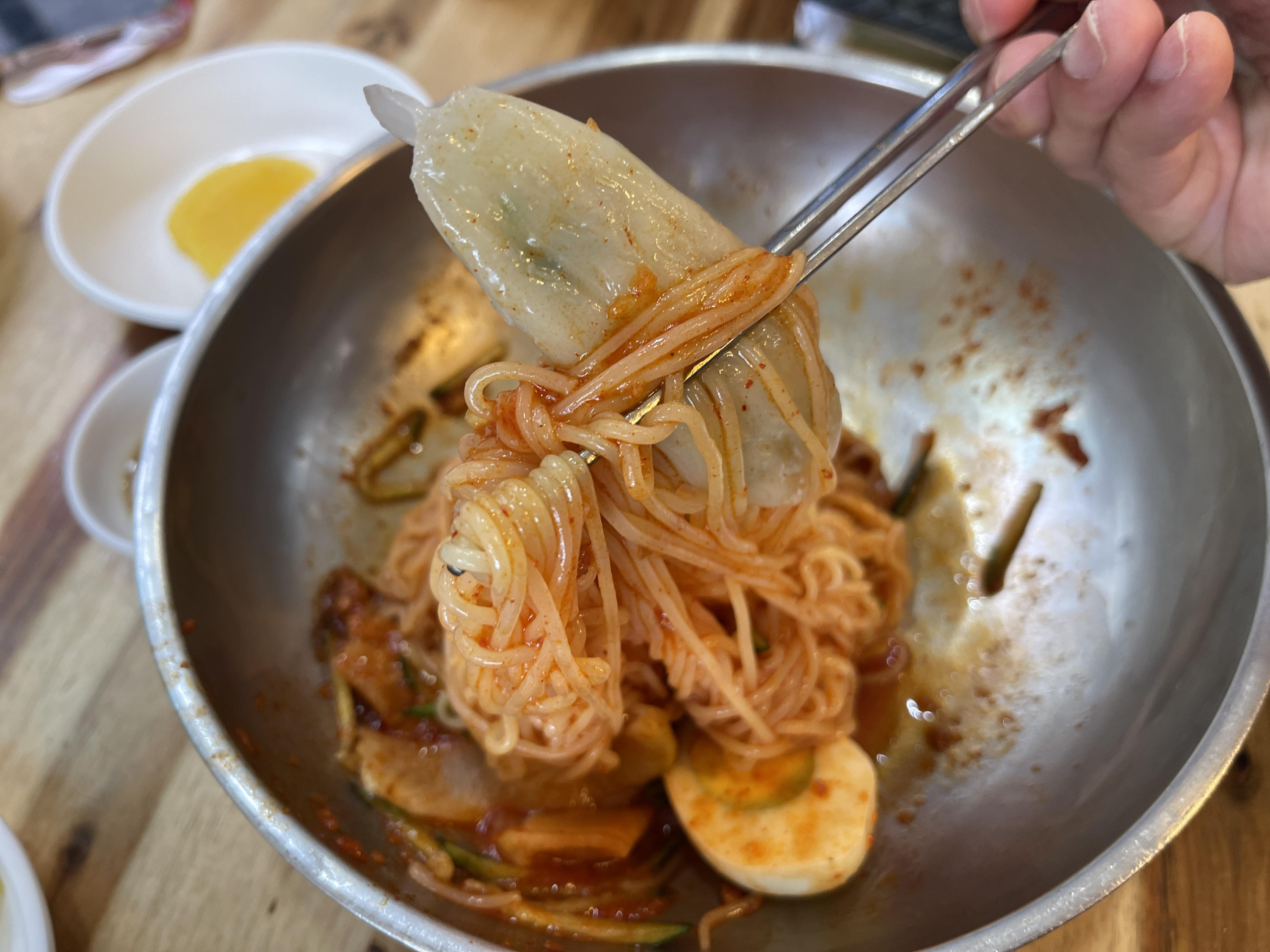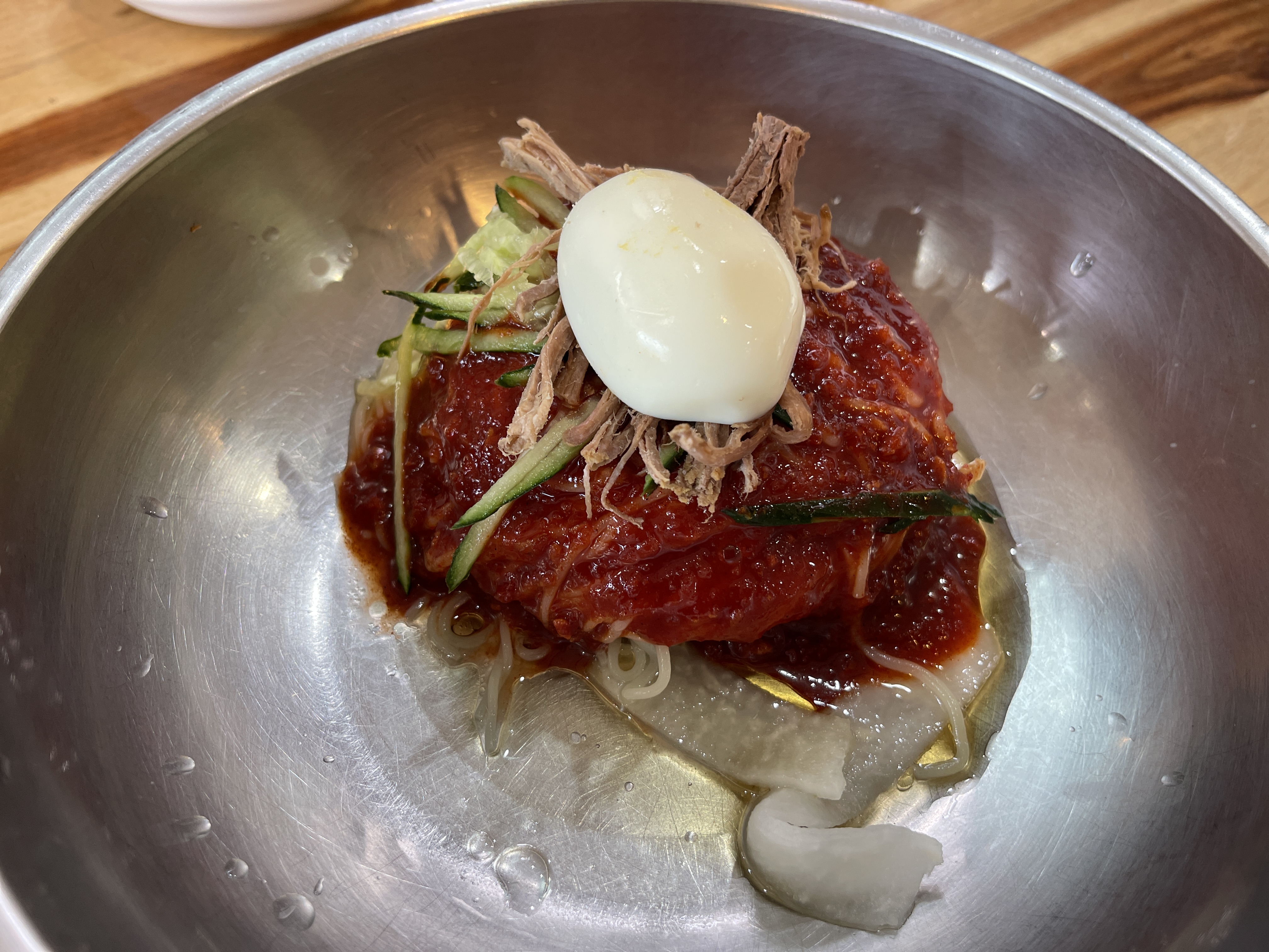 몸에 좋은 건 전부 때려넣고 푹 끓였다는 육수. 진한 국물이 육수맛의 깊이를 대변해주는 것 같다. 시원한 육수 한모금 들이키면.. 오... 좋다 좋아. 부산에서 처음 물밀면을 먹을 때만해도.. 무슨맛인건가 싶던 시절도 있었는데.. 지금은 익숙해져서인지 면의 식감과 육수 모두 만족하게 되었다.